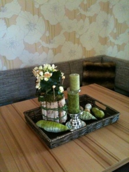 In der Couchecke wurde 2010 maigrüne Spachteltechnik aufgebracht. Neue Gardinen angebracht und die Fensterbank passen bezogen.