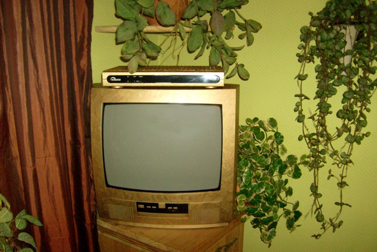 Garantie ist abgelaufen - Kiste läuft noch = Zeit, das unansehnliche Grau loszuwerden! Auf den anderen Fotos seht ihr, wie die Glotze vorher ausgesehen hat. Habe das Gerät einfach mit goldfarbigem Acryllack bemalt. So paßt das Gerät schon viel besser ins Farbkonzept ;-)