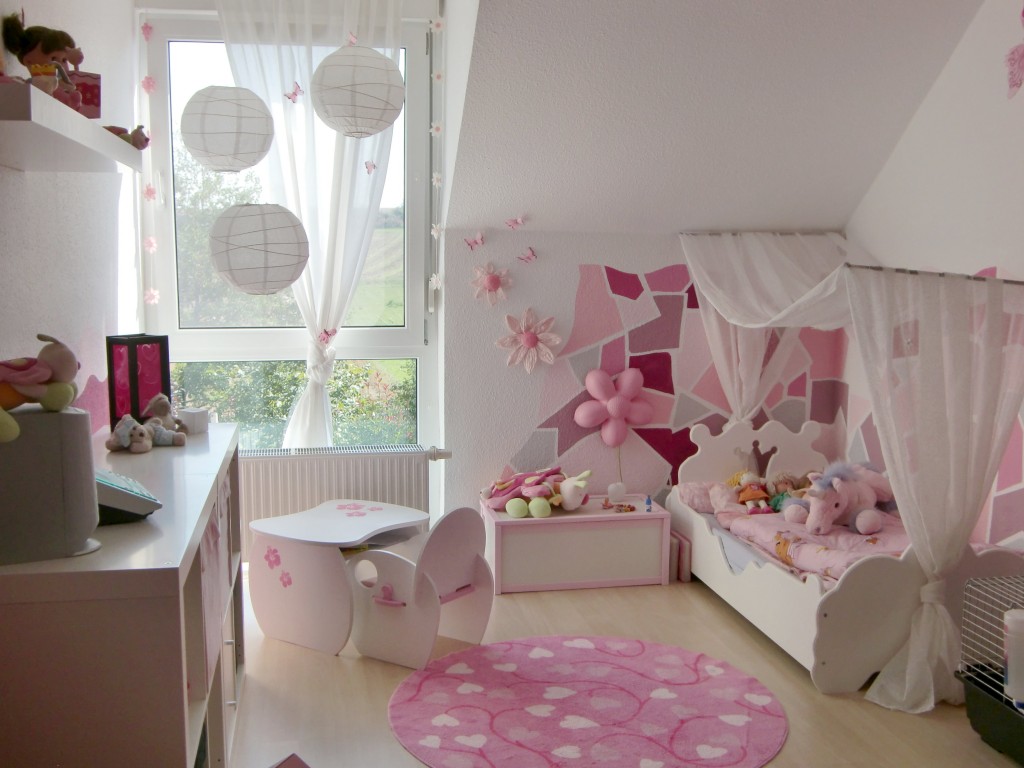 21.488hier das neue Zimmer meiner Prinzessin, es ist noch nicht ganz fertig- aber ein schicker Anfang Das Zimmer ist in verschiedenen rosa / weiß Tönen gehalten um ganz Prinzessinen like zu wirken. Ich habe vermieden eine bestimmte Figur einzuarbeiten da die Geschmäcker der kleinen Damen ja bekanntlich variieren heute Kitty morgen Spongebob und dann doch wieder lilly fee- also ohne alles.Das Mosaik ist handgemalt ohne Vorlage einfach drauf los gemalt und der Rest entstand im Kopf.Das Prinzessinen Bett habe ich mit einer Wasserbettmatratze aufgewertet für einen erholsamen Schlaf. Die Truhe ist von der Ikeá- bekommt man für nen Appel und ein Ei- einfach die Eckleisten lackiert und ein Schloß drauf gemalt und aus neu mach schön :o. Den Eckschrank habe ich in der Farbe ( war braun)einfach angeglichen und im Design passend zum Zimmer gestaltet.