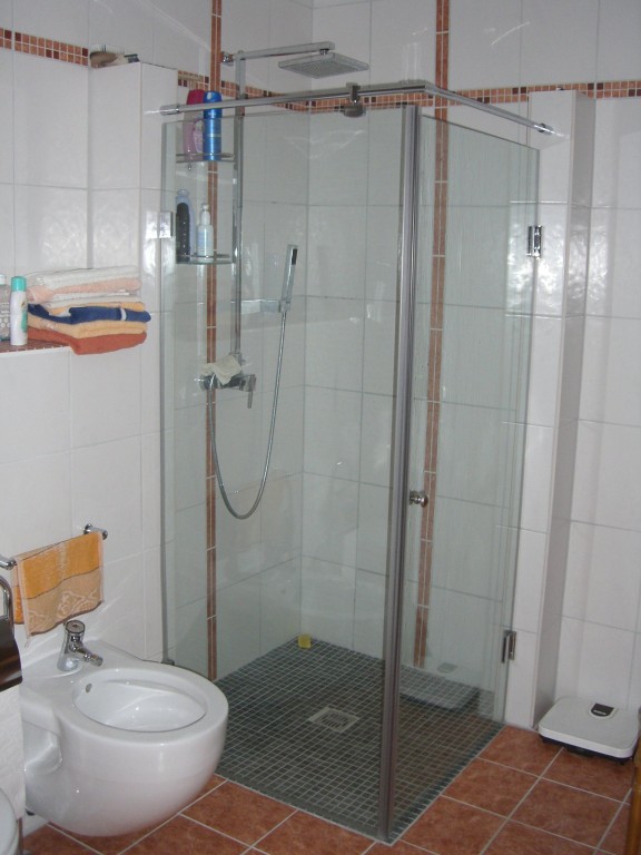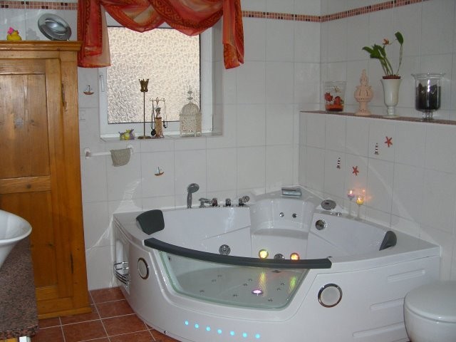 Das Badezimmer ist eine kleine Badoase mit Whirlpool und begehbarer barrierefreier Glas-Dusche. Ebenfalls alles im mediterranen Stil eingerichtet.