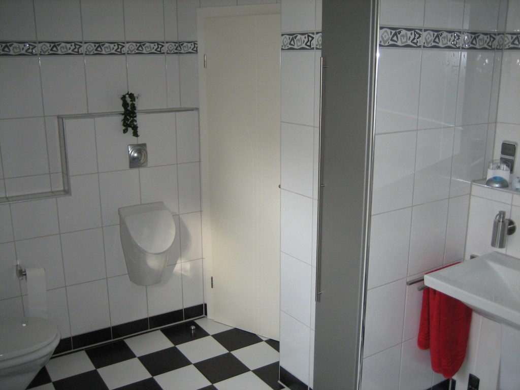 11.415Auch in unserem Bad mußten wir zweckmäßig der Raumaufteilung eine tragende Wand entfernen. Wir wollten halt eine große Oase zum Baden haben. Wir haben das ehamlige Gäste WC mit dem Hauptbad verbunden. Ausgestattet haben wir unser Bad auf dringlicher durchsetzung meines Mannes mit einem Urinal versehen.