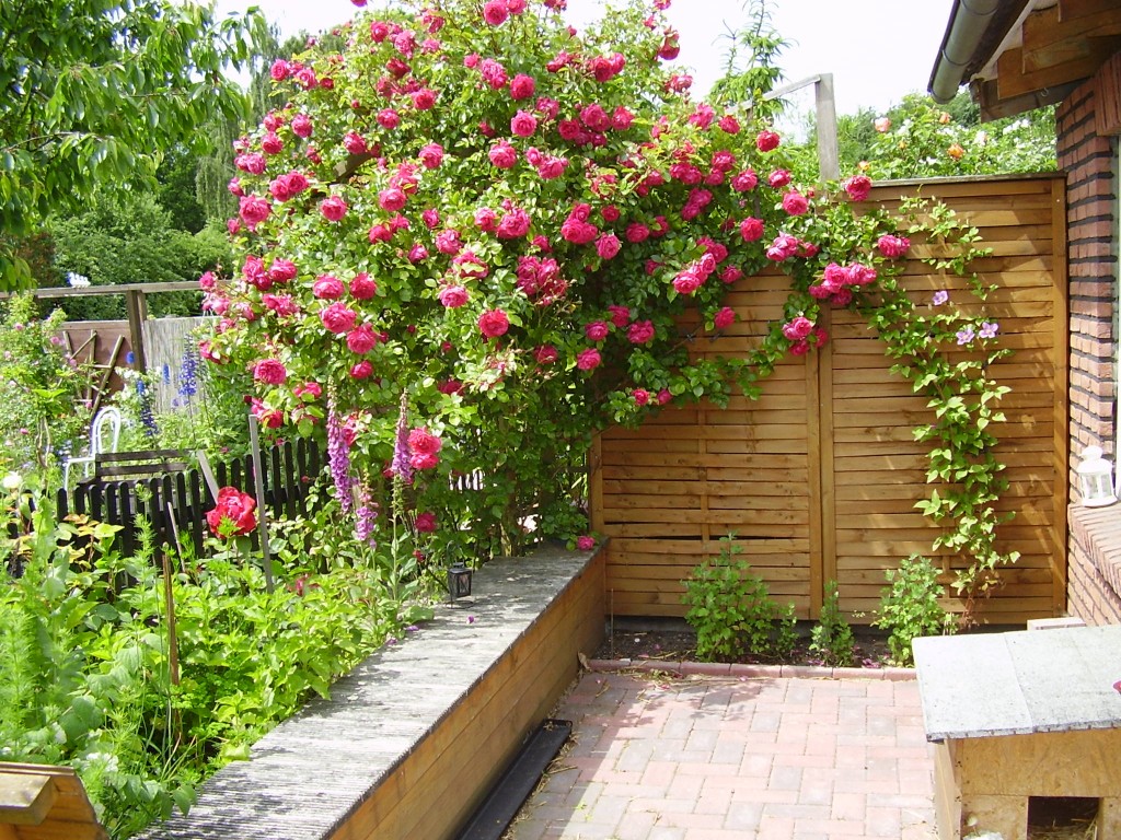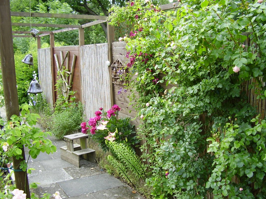 Das ist die kleine Terrasse meiner Tochter mit Katzenhäuschen unten rechts und langer Holzsitzbank.