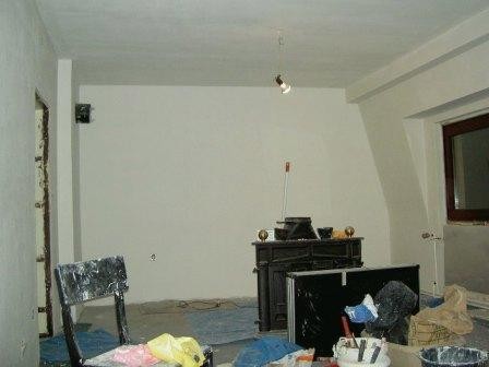 alle Tapeten runter, Gipskartonwand gespachtelt, alte Leimfarbe von der Zimmerdecke gewaschen, Decke mit Tiefengrung vorbehandelt und Reparaturvlies an die Decke