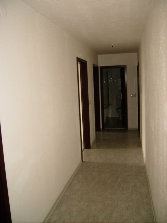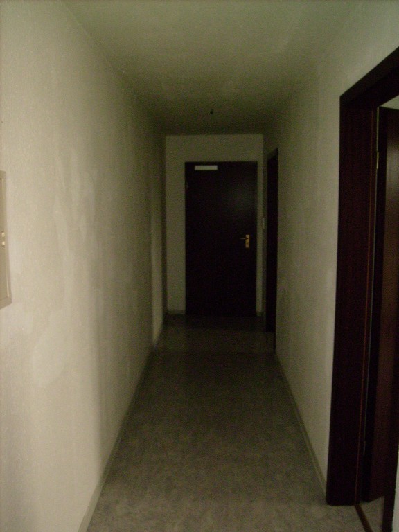 der Flur ist soo lang und nur 1,20 breit. Die Türen sind dunkel, wie man erkennen kann. Ganz hinten die offene Tür ist das Bad und die geschlossene Tür der Wohnungseingang.