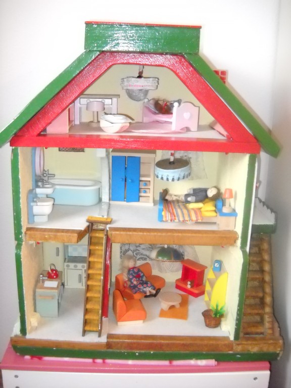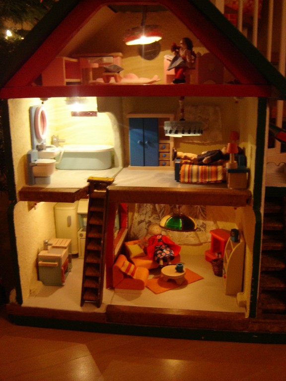 Das ist mein altes Puppenhaus. Das wurde damals für mich selbst gebaut- ich habe es dann für meine Tochter restauriert und neue Möbel gekauft- es hat sogar Licht!