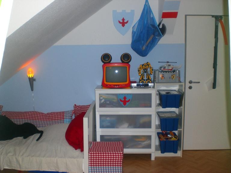 33.116meine mäuse teilen sich einen raum und ich hab ihn einfach durch stoff getrennt. Für meinen sohn ein Ritterzimmer und meine tochter ein Blumenzimmer. Die Gardinen, kissen und vorhänge sind bei meinem sohn aus Tischdecken selber genäht. die Burgzacken auf dem schrank meines sohnes sind aus styropor und mit der restlichen wandfarbe bemalt,genau wie der schreibtisch (alter esstisch) ;-)