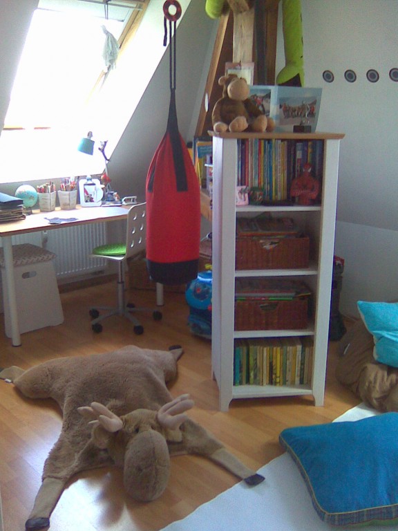 Wir haben versucht, durch das Regal das Zimmer zu unterteilen in Schlaf/Schularbeiten- und Wohlfühl-/Fernsehbereich