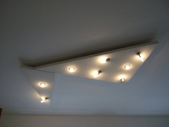 Dieses Lichtmodul mit 2 Lichtsystemen habe ich in den Ferien für meinen großen Sohn gebaut. Es ist mit 2 mm Scheibenputz strukturiert. Da es freihängend mit Zentralabhängern befestigt ist, kann es immer wieder ohne Schaden abgebaut werden. Es ist eigentlich für alle Wohnbereiche geeignet.