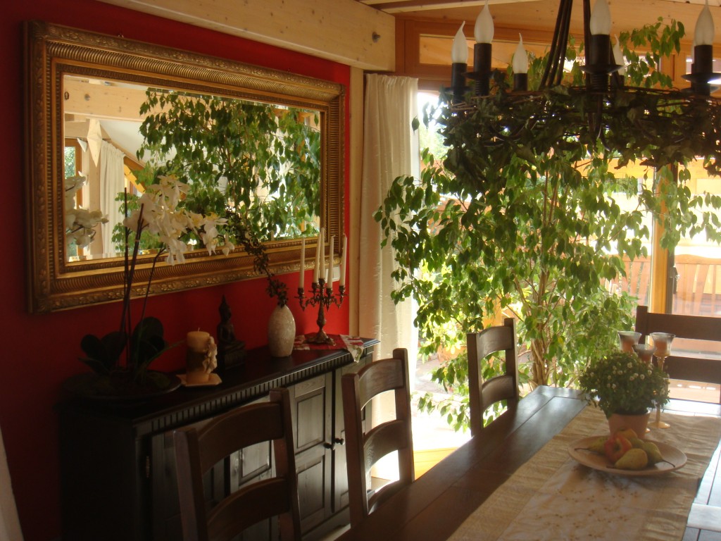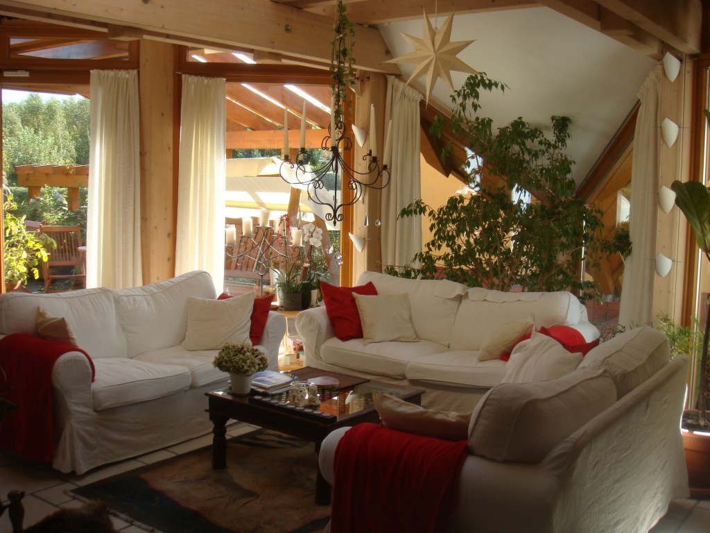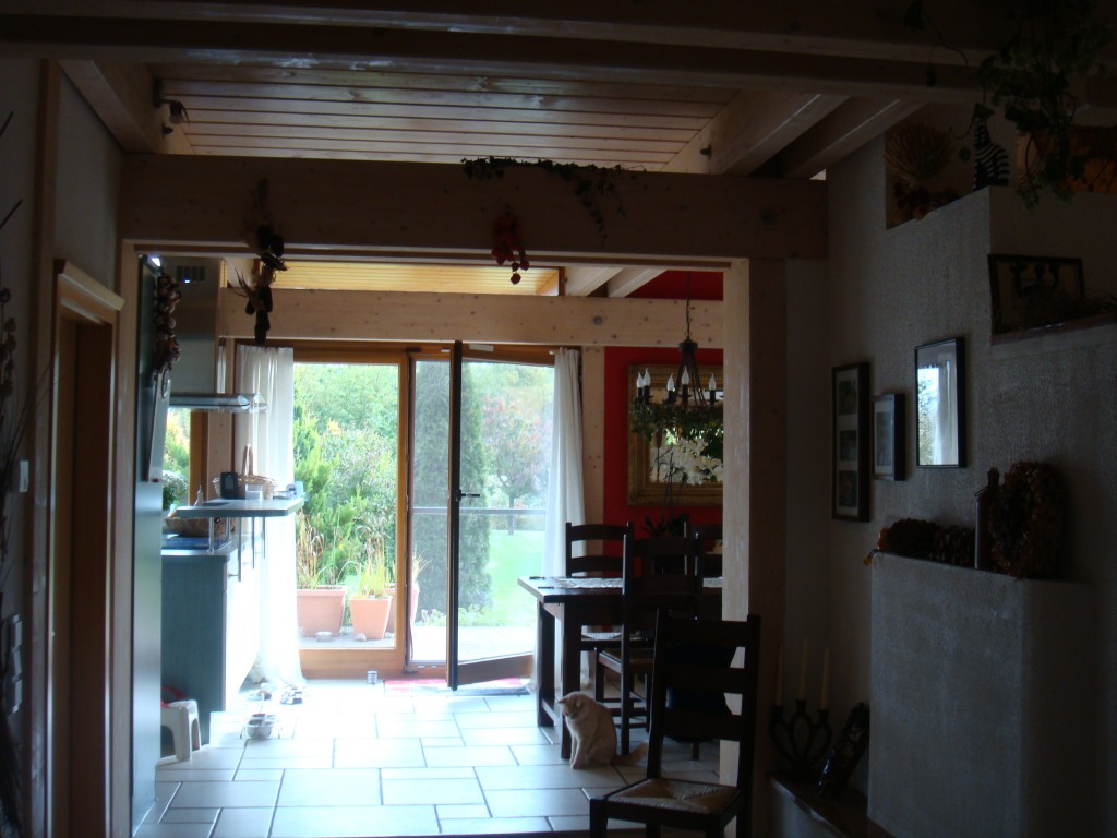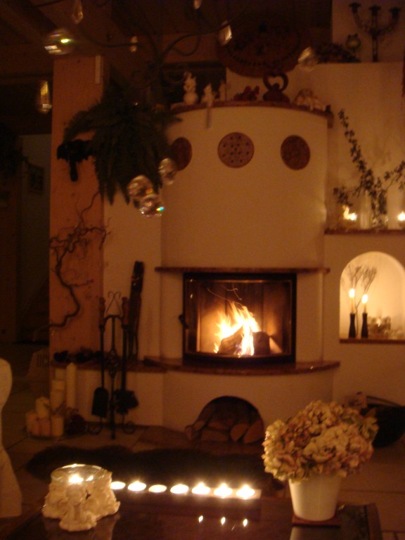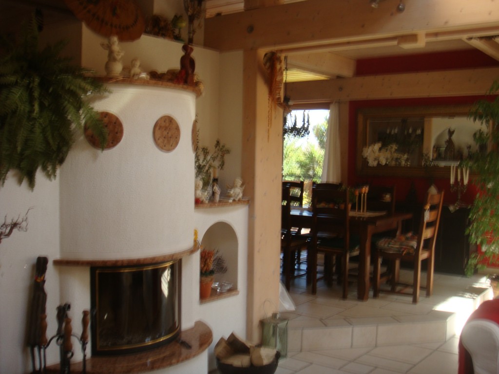 Wir haben unseren Wohnbereich in 3 Zonen geteilt. Der Essbereich, der Kuschelbereich vor dem Kamin und der Fernsehbereich. Angrenzend im offenen Bereich liegt die Küche. Der Kamin dient als Raumteiler.
