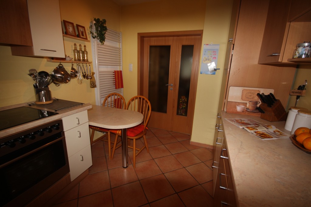 24.627Zusammengewürfelte Küche, aus der Not heraus mit zwei Fronten-Farben, bereits in die Jahre gekommen...aber immer noch praktisch, auch mit dem kleinen Thekentisch, an dem ich morgens mit den Kindern frühstücken kann.... wenn wir Platz für die ganze Familie und Freunde brauchen, gehen wir einfach an die große Tafel im angrenzenden Eßzimmer!