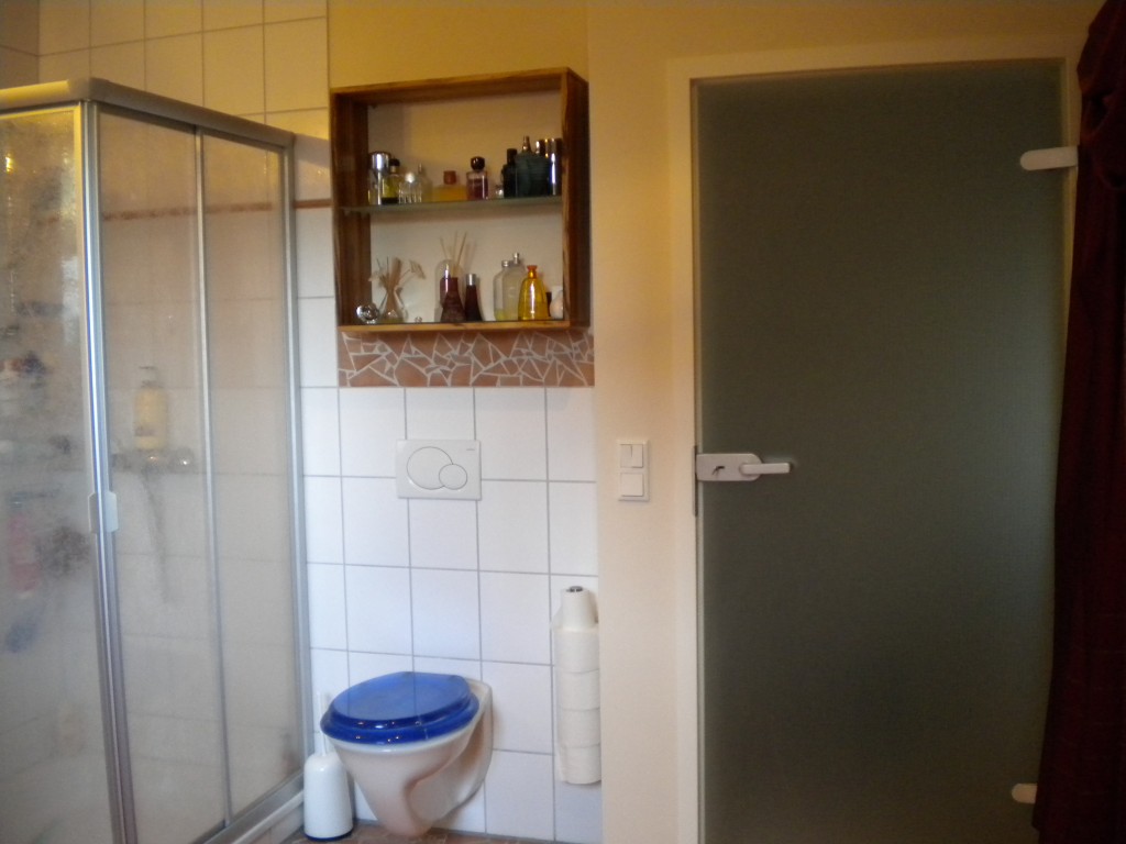 8.107Mit unserem sehr großen und recht neuen Bad sind wir sehr zufrieden. Der Sari und damit auch die Buddhas sind durch einen Zufall entstanden. Der Spiegel hang schon und wir haben recht schnell festgestellt, dass man sich im Augenwinkel selbst auf dem Klo sitzen sieht. Da mußte Abhilfe her... Einfach matt abkleben fanden wir nicht so doll, also mußte der Sari (altes Karnevalskostüm) dran glauben. Schaut auf die Fotos da steht was noch alles geändert werden soll. Badewanne und Dusche sind tiefer im Boden eingelassen und eine Fußbodenheizung gibts auch ;)