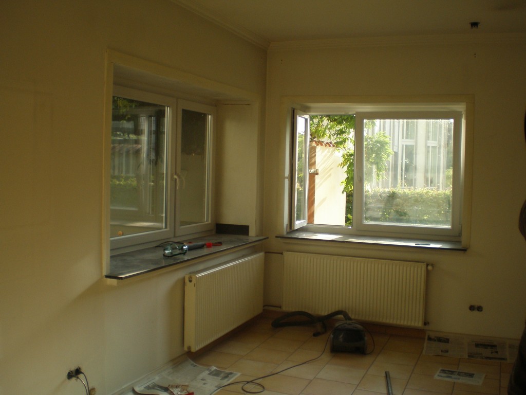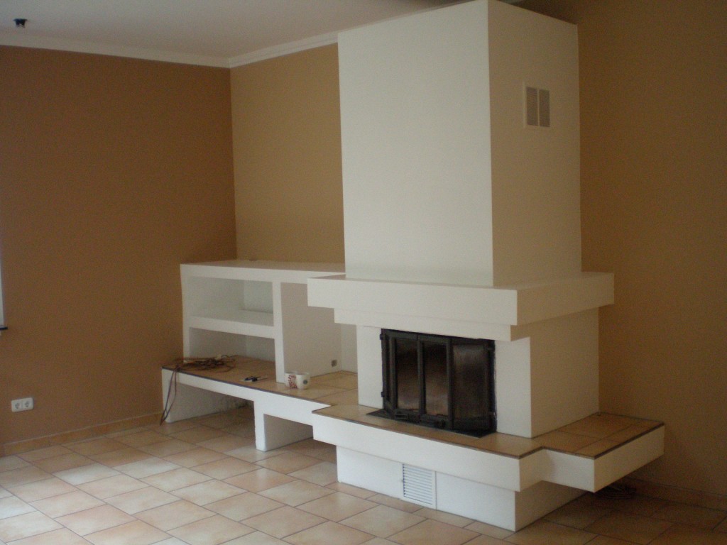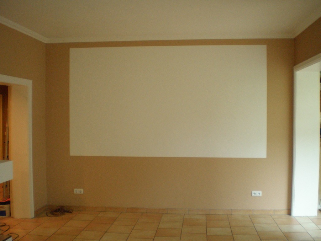 Im Sommer haben wir endlich Farbe ins Wohnzimmer gebracht......und die Beamer-Wand wurde hergerichtet ;-) Die Kaminseite dient als Regal für TV und Anlage.