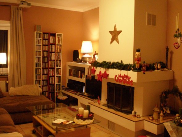 Im Sommer haben wir renoviert und nun haben wir einen hellbraunen warmen Ton an den Wänden und haben nur die Beamer-Fläche weiß gelassen. Dominierend ist der Kamin und das Sofa, in das wir uns vor vier Jahren unsterblich verliebt hatten ;-)