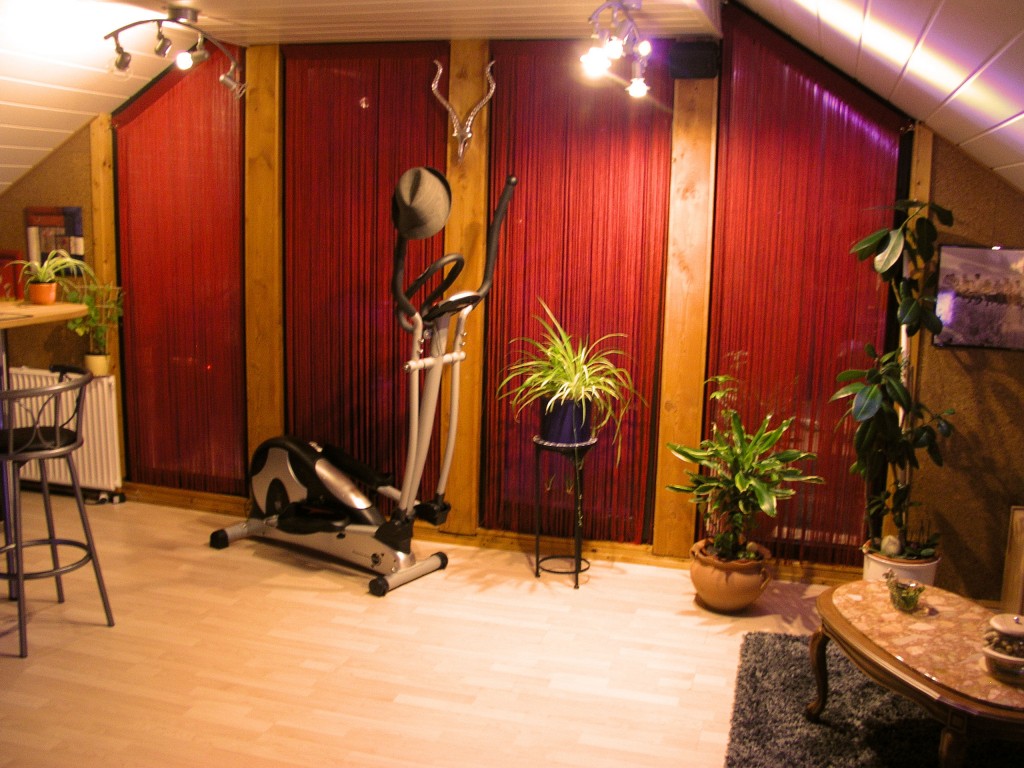 Die Wände sind mit Kork versehen, was dem Raum nicht dunkel aussehen lässt, aber Gemütlichkeit zeigt wie in einer Lounge. Altes Laminat welches eigentlich erneuert werden müsste, aber es ist gepflegt. Durch die Dachschrägen gweinnt dieser Raum optisch was an Tiefe. Ein 4m langes Panoramafenster lässt den Raum offen und hell wirken. Die Aussicht in den Westerwald ist gigantisch. Auch aus dem Dachfenster lassen sich Nachts die Sterne beobachten.