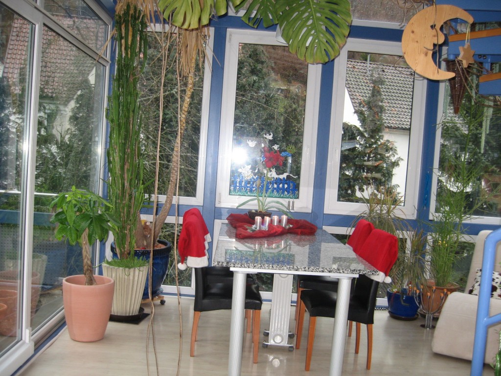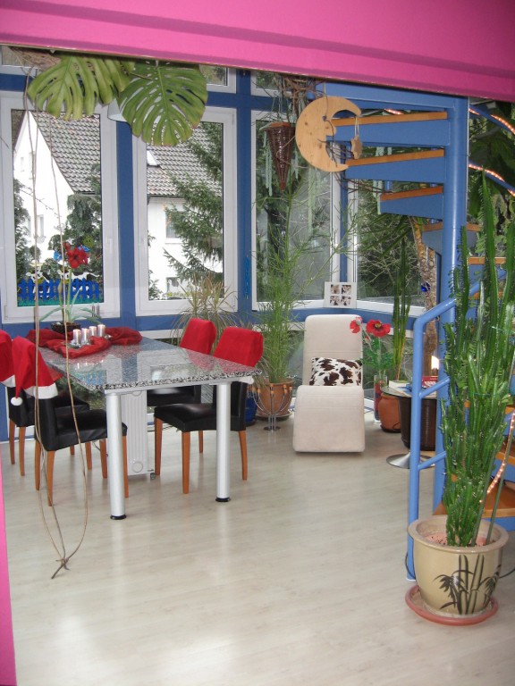 5.776Anbau Wintergarten welcher zum Wohnraum geöffnet ist, dient als Esszimmer und die Wendeltreppe führt ins Schlafzimmer! Die Holzbalken würde ich heute nichtmehr blau streichen, naja, ist halt mal so....