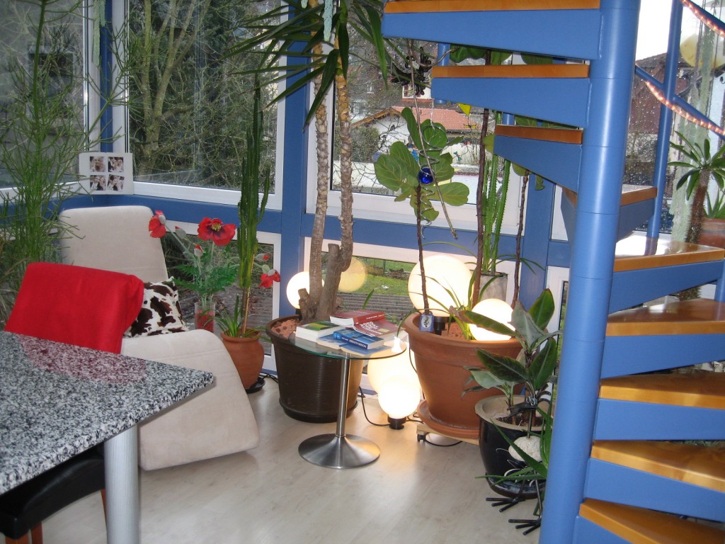 Anbau Wintergarten welcher zum Wohnraum geöffnet ist, dient als Esszimmer und die Wendeltreppe führt ins Schlafzimmer! Die Holzbalken würde ich heute nichtmehr blau streichen, naja, ist halt mal so....