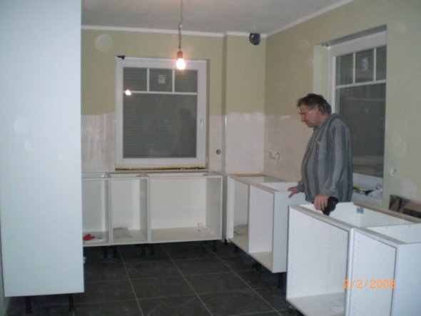 Die Küche kostet Nerven beim Aufbau, umso schöner und leichter war die Fototapete anzubringen. Hier kommen noch dunkle Esszimmermöbel her. Unser Wohnküche wird dann 26 qm groß sein- wir sind ja auch zu 4!