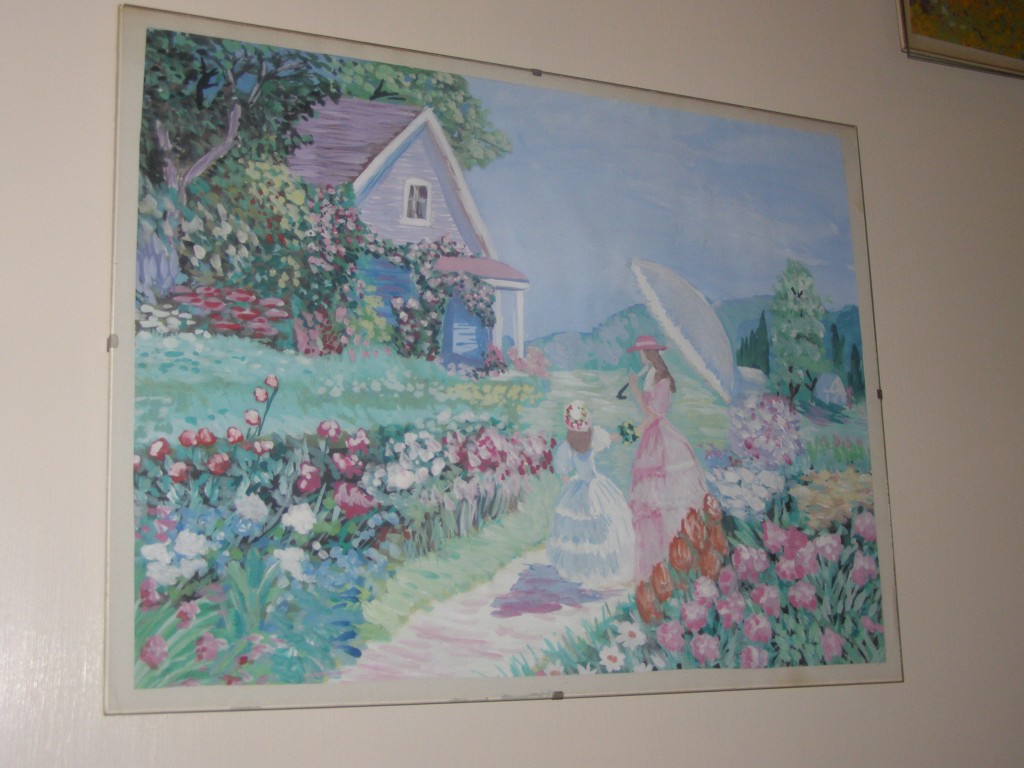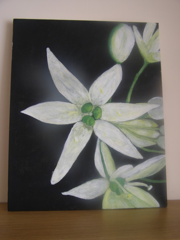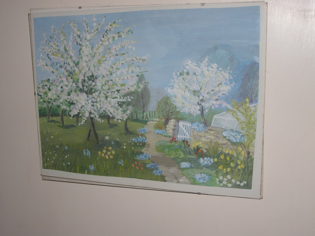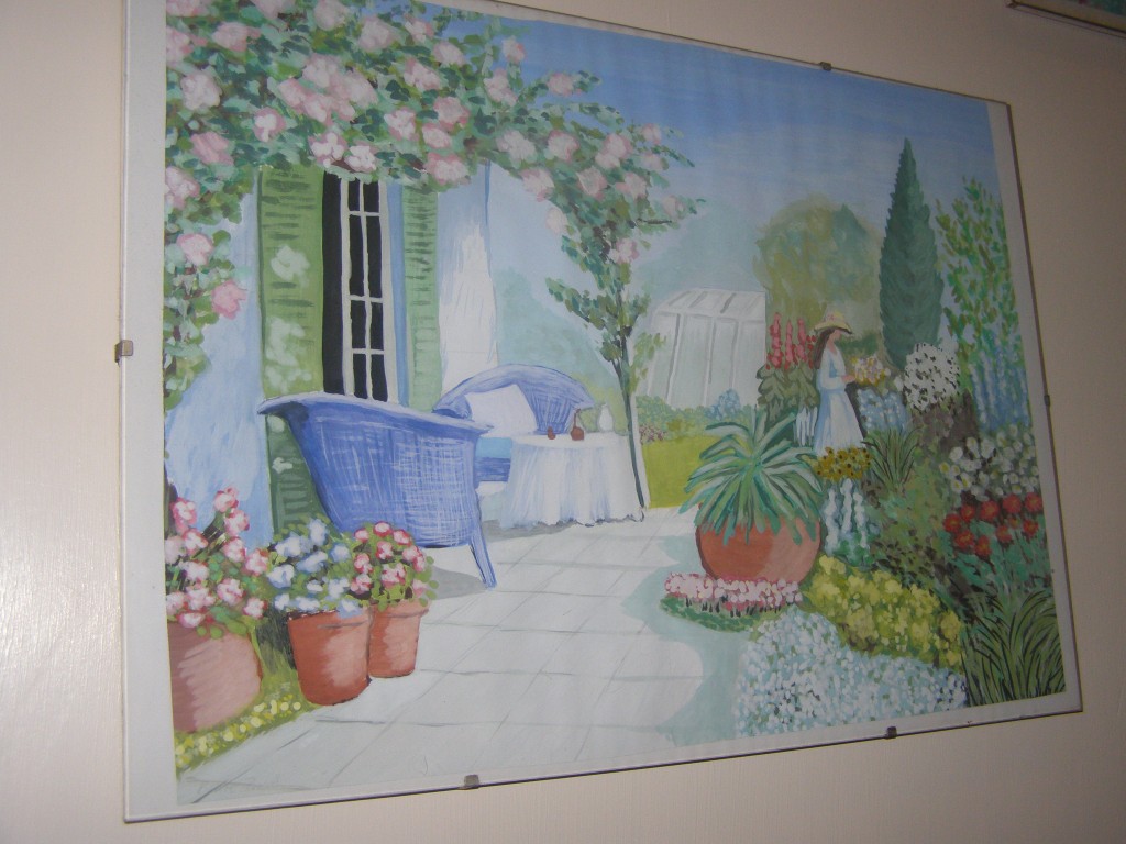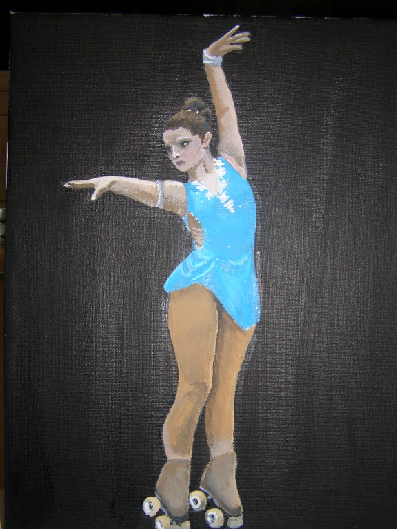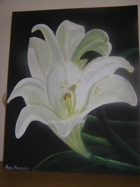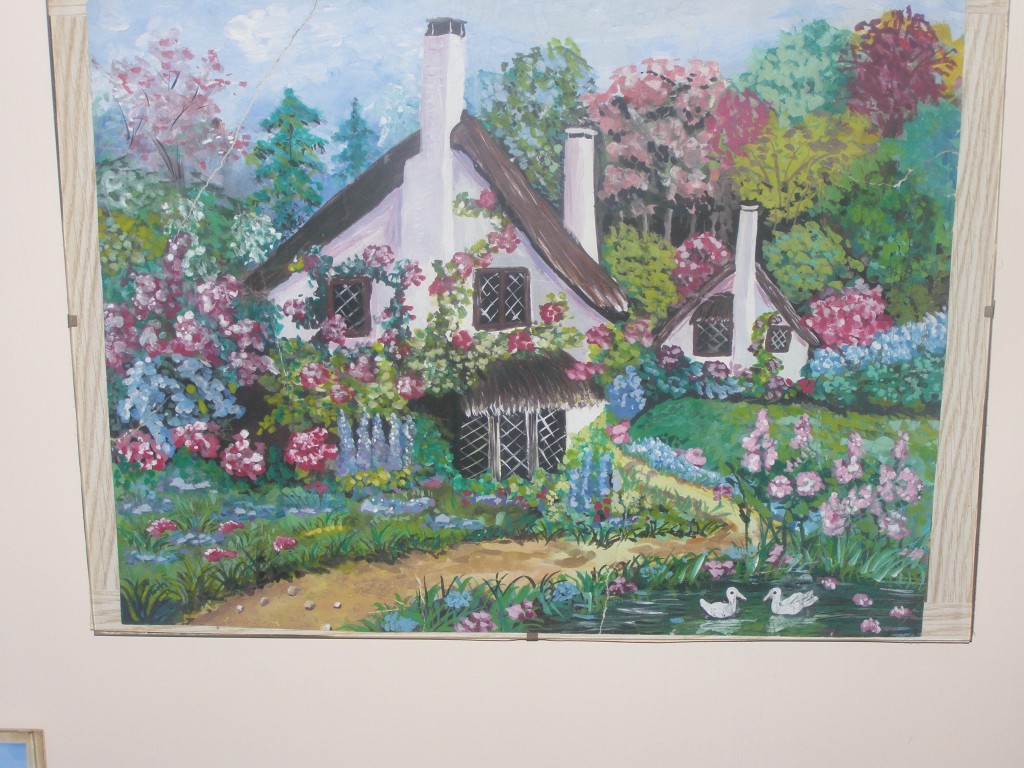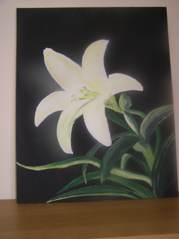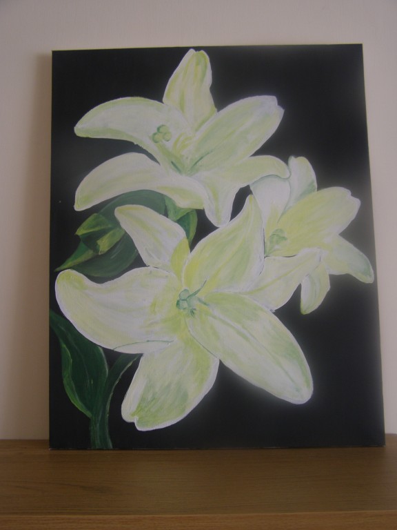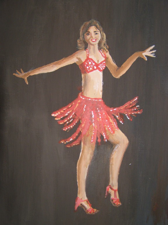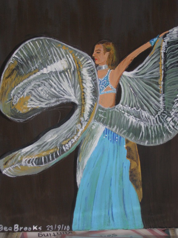 7.309Die weissen Blumen habe ich fuer mein Wohnzimmer gemalt. Die Bauchtaenzerin ist das erste von 4 Taenzerinnen die ich malen moechte. Mein naechstes Project sind die Maedels vom Rollschuhclub. Angefangen hab ich mal mit meiner Tochter Tanya. Um ein paar haessliche loecher in der Wand zu verstecken hab ich ein grosses Winterbild gemalt. Die zwei netten Manner sind Schauspieler hier. Sie waren die haesslichen Schwestern in Cinderella, wo ich kuerzlich hinter der Buehne ausgeholfen habe.