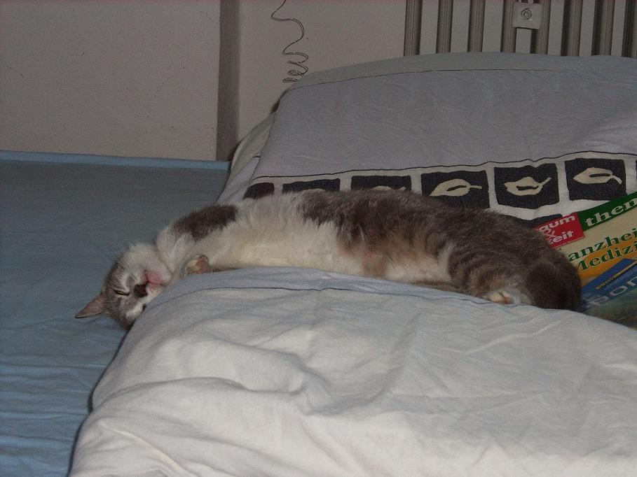 Nach dem Tod unseres Thommys ist sie uns als Streunerkatze zugelaufen. Damals war sie hochschwanger. Als die Geburt losging blieb ich immer bei ihr. Normalerweise dauert so eine Katzengeburt nicht lange. Doch bei ihr gab es Komplikationen. Es dauerte 5 Stunden bis das erste Kind - tot - da war. Dann ging es nicht mehr weiter. Sie hatte keine Wehen mehr. Also bin ich mit ihr zum Tierarzt und sie bekam einen Kaiserschnitt. Die beiden weiteren Kinder kamen noch lebend aus dem Mutterleib, starben allerdings innerhalb einer halben Stunde. Plötzlich hörten sie auf zu atmen und sich zu bewegen. Seit dem lebt die Mietzi bei uns und ist total anhänglich ;-)