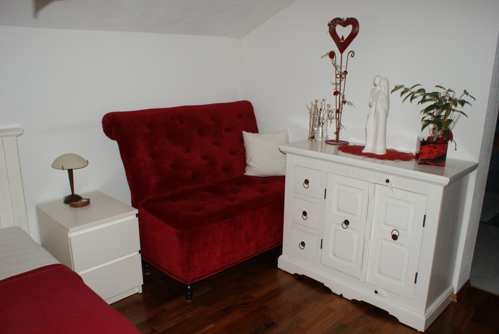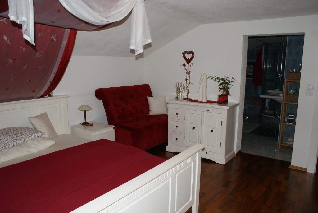 Gemütliches Schlafzimmer in rot. Verschiedene Lichtelemente (an der Decke/ 2x auf dem Nachttisch/ aus dem Bad/ und links an der Wand zum dimmen)....