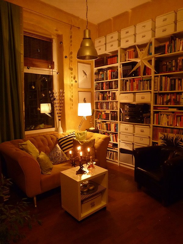 Wie immer ohne großes Budget eingerichtet: Sofa gab's für 25 Euro bei Ebay, die Regale haben sich über's Studium hinweg angesammelt, die Deckenlampe ist ein Erbstück mit Historie, die Tische habe ich geschenkt bekommen .... und so weiter. Eine bunte Kuschel- und Leseecke für eine bunte Person.