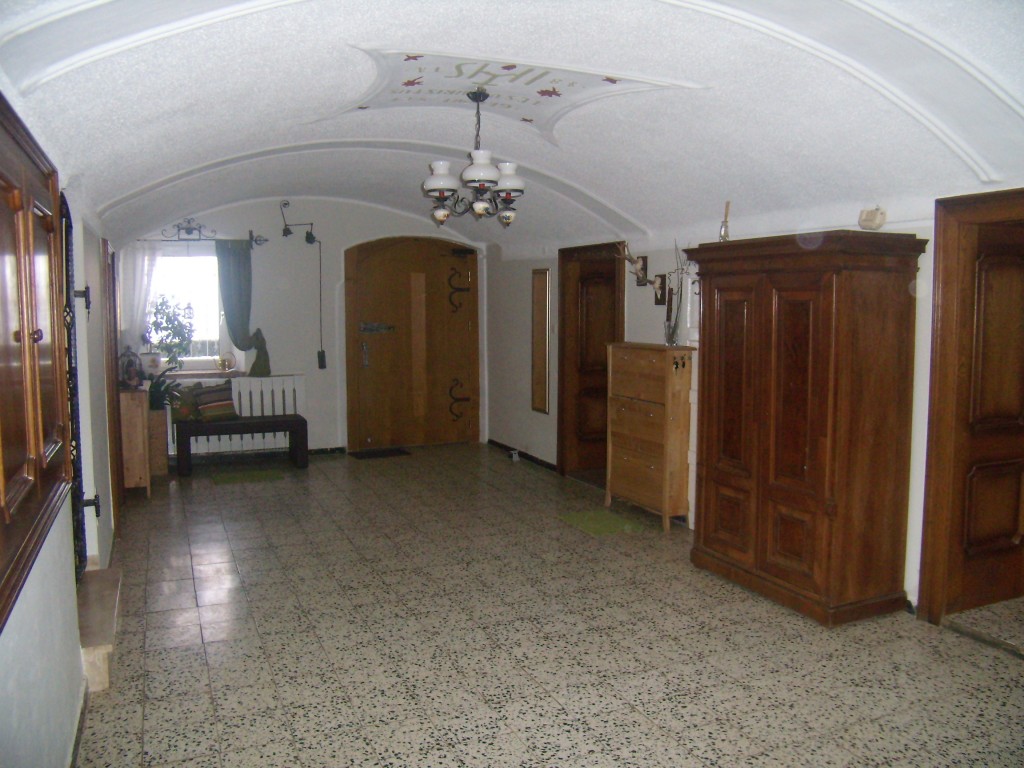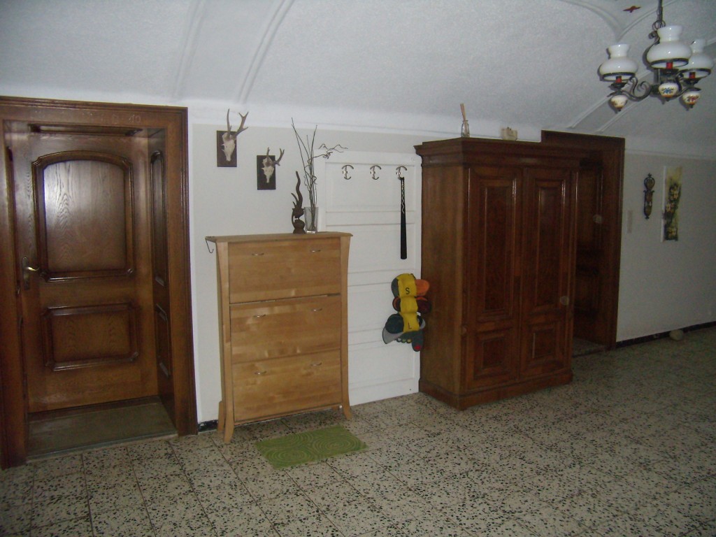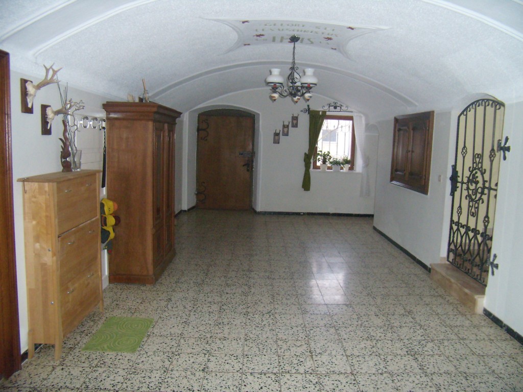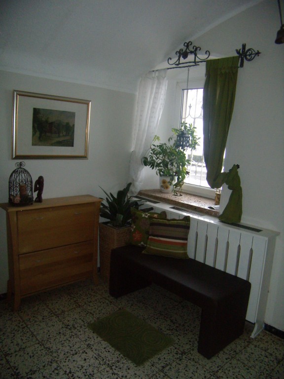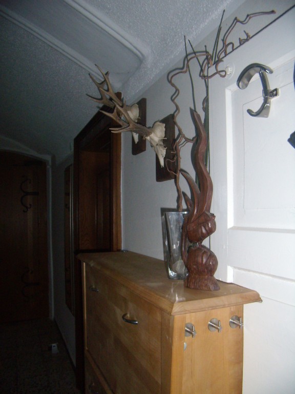 Der altdeutsche Kasten beherbergt unsere Mäntel und Jacken. Die Garderobe daneben war einst eine Tür und die Schuhschränke bieten Platz für unsere Schuhsammlung.
