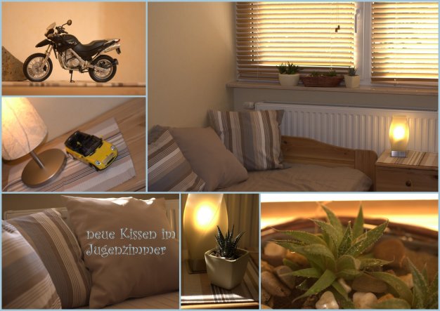 18.210Im Februar 2010 hat unser Sohn das etwas größere Kinderzimmer bezogen. Die Wandtapetenborte wurde "von Pferden zu Flugzeugen" verändert und er hat die Massivholzmöbel seiner Schwester übernommen. Nun fehlte noch eine schöne Tagesdecke für das Bett und passende Kissen!! Neulich fand ich dann auch noch Tischsets in den passenden Streifendesign! :-)