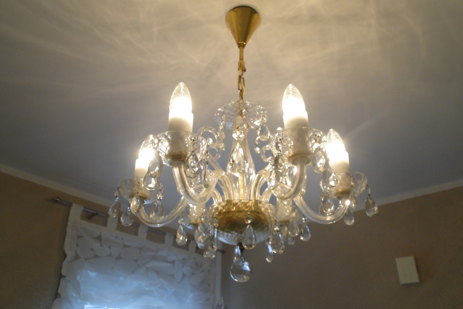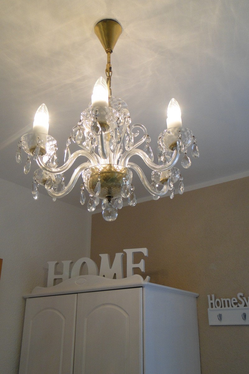 Den Kronleuchter habe ich von meiner UrOma geerbt, er ist so um die 50 Jahre alt vermute ich, wenn nicht sogar noch älter.