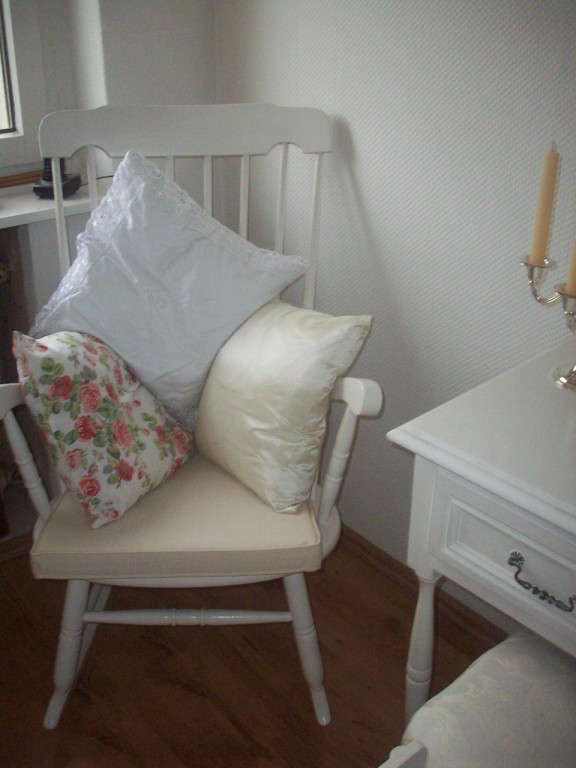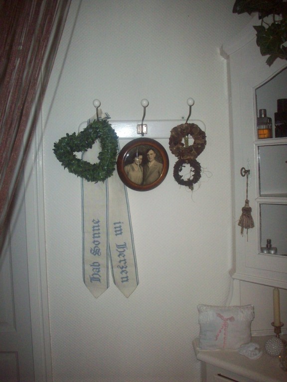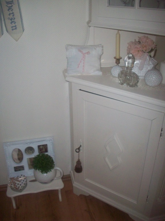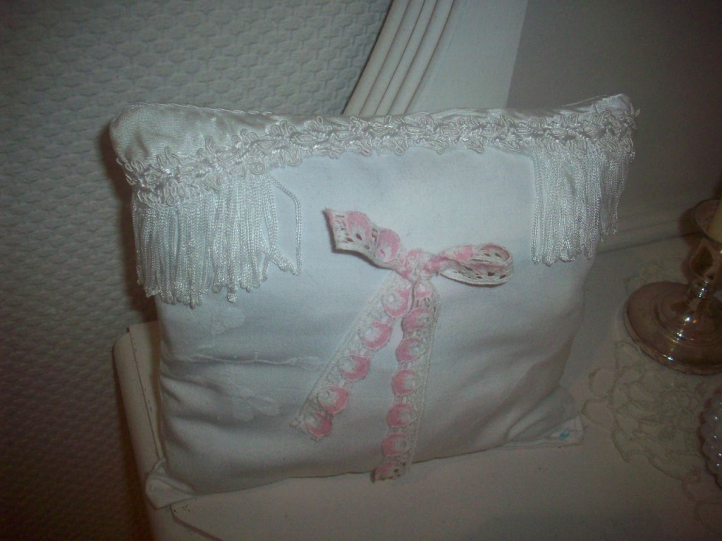Das Kissen ist eines von denen, die ich aus alter Weißwäsche genäht und mit Zeugs, was ich so im Nähkasten gefunden habe, verzierte. Das ist ganz leicht.