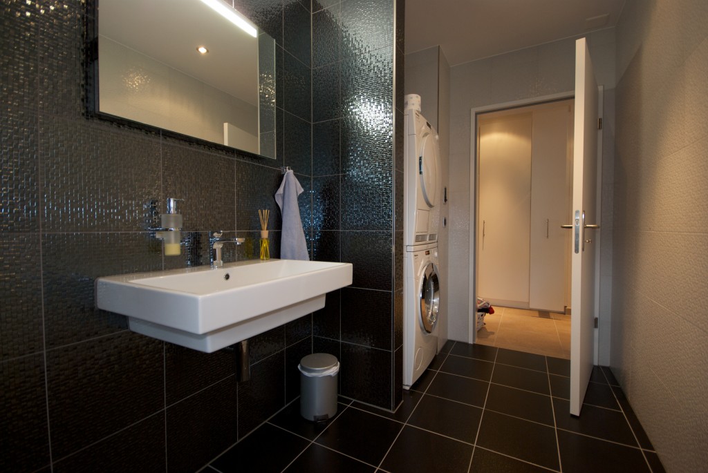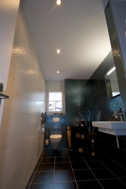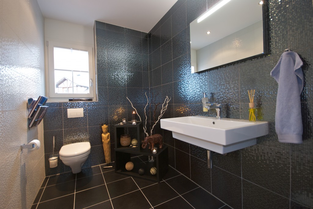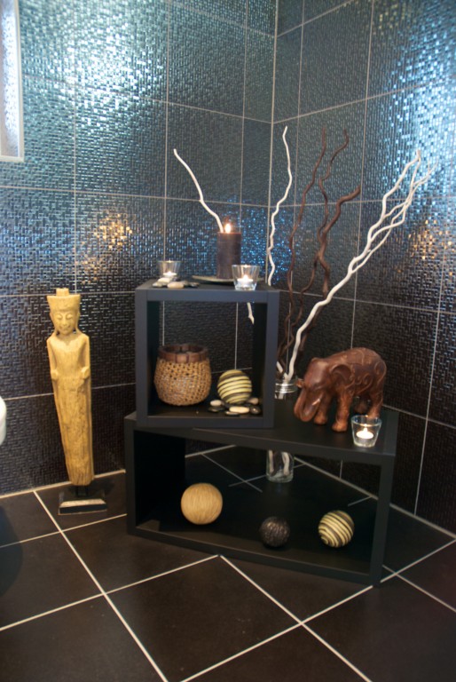 Gästebad mit schwarzen und weissen speziellen Platten, momentan asiatisch dekoriert
