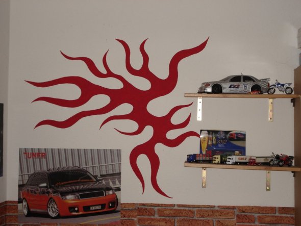 dieses auto habe ich nach wunsch meines sohnes an die wand gemalt, ebenfalls die autotatoos,die ich zwischen den postern gemalt habe