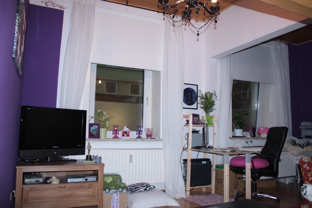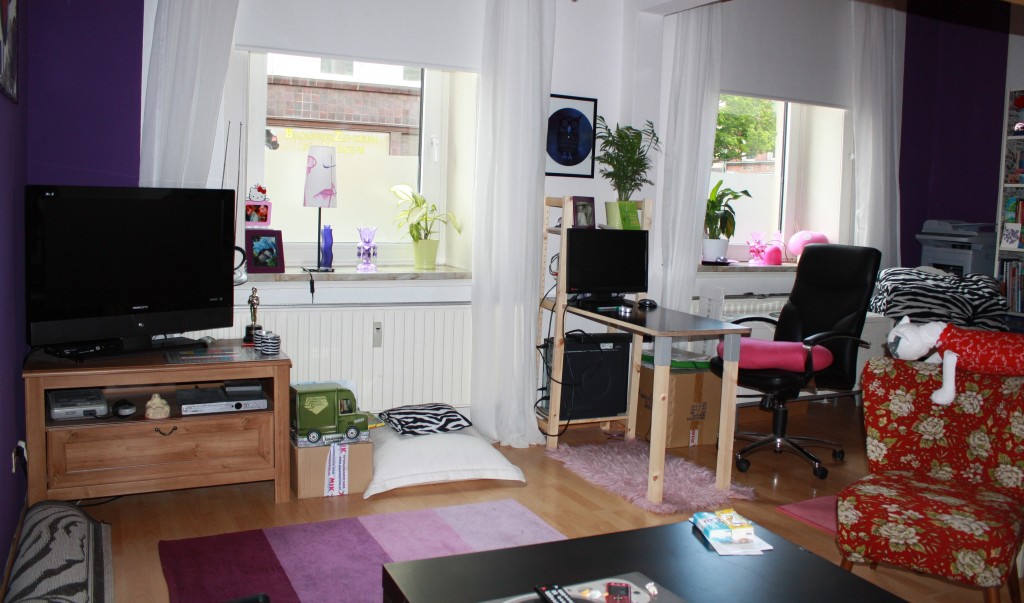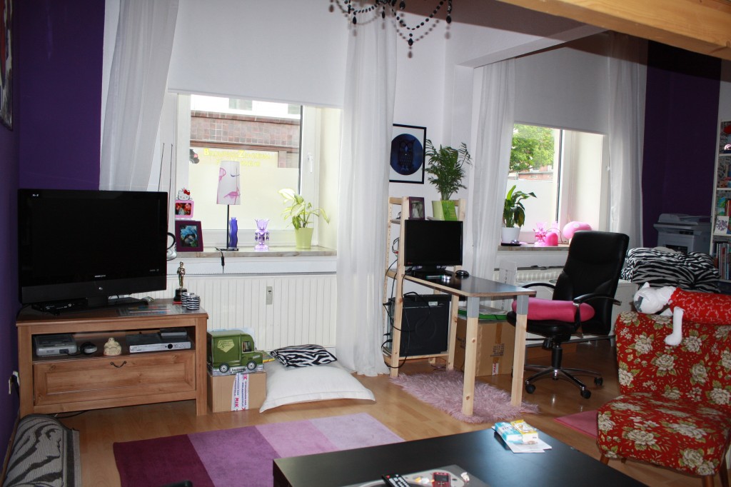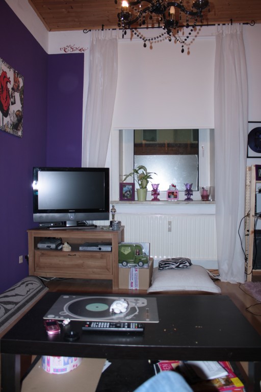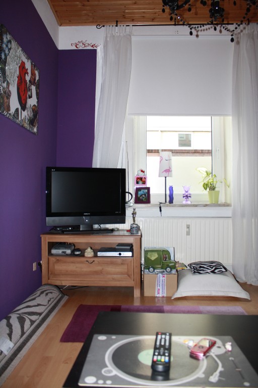Mein Wohnzimmer, zwei kleinere Räume die durch einen Durchbruch verbunden sind. Im vorderen Teil befinden sich Kleiderschrank, Kommoden, Regal im zweiten Teil Sofa, TV, Schreibtisch und ein Hochbett zum Schlafen