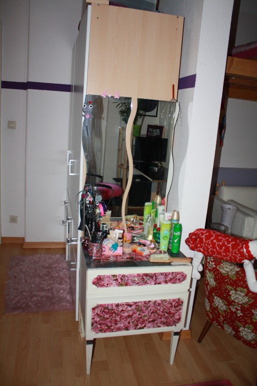 meine alten Spiegel habe ich an die Seite des Kleiderschranks gelehnt. Die Kommode dient als "Schminktischchen"