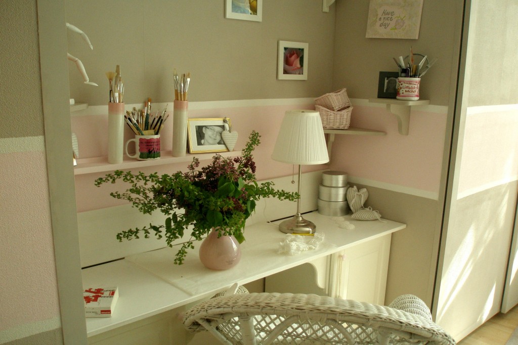 den arbeitsplatz habe ich aus zwei küchenoberschränken und 2 leimholzplatten gemacht. die platte kann man vorzieh somit wird der arbeitsplatz 60 breit. hoch geklappt 40 cm. mit regalhalter vom schweden und selbst lackierten knöpfen aufgepeppt.