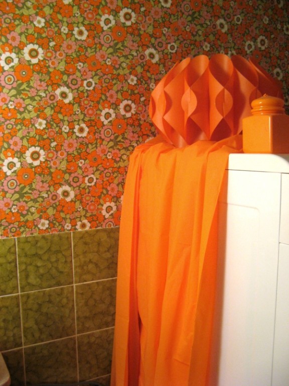 Bad ist noch nicht fertig. Aber auch hier - Tapete bei ebay gesehen, und die passt doch super zu den Fliesen. Wenn scheußlich, dann wenigstens richtig ;) Dazu ein passender Duschvorhang, Lampe und Deko.