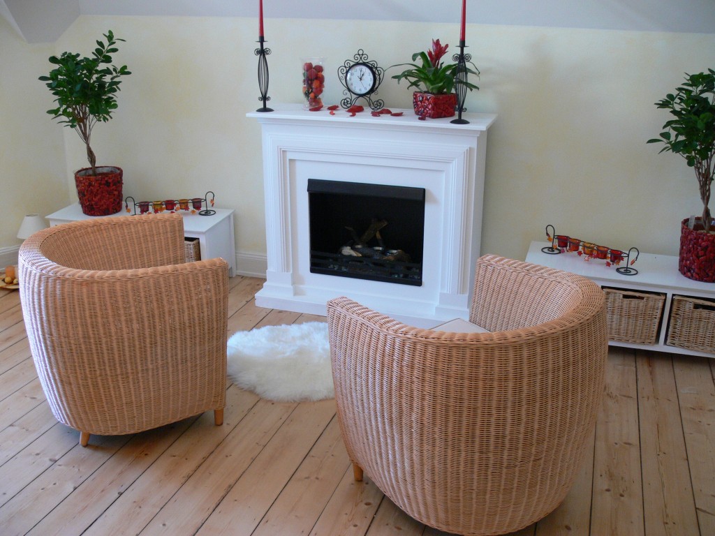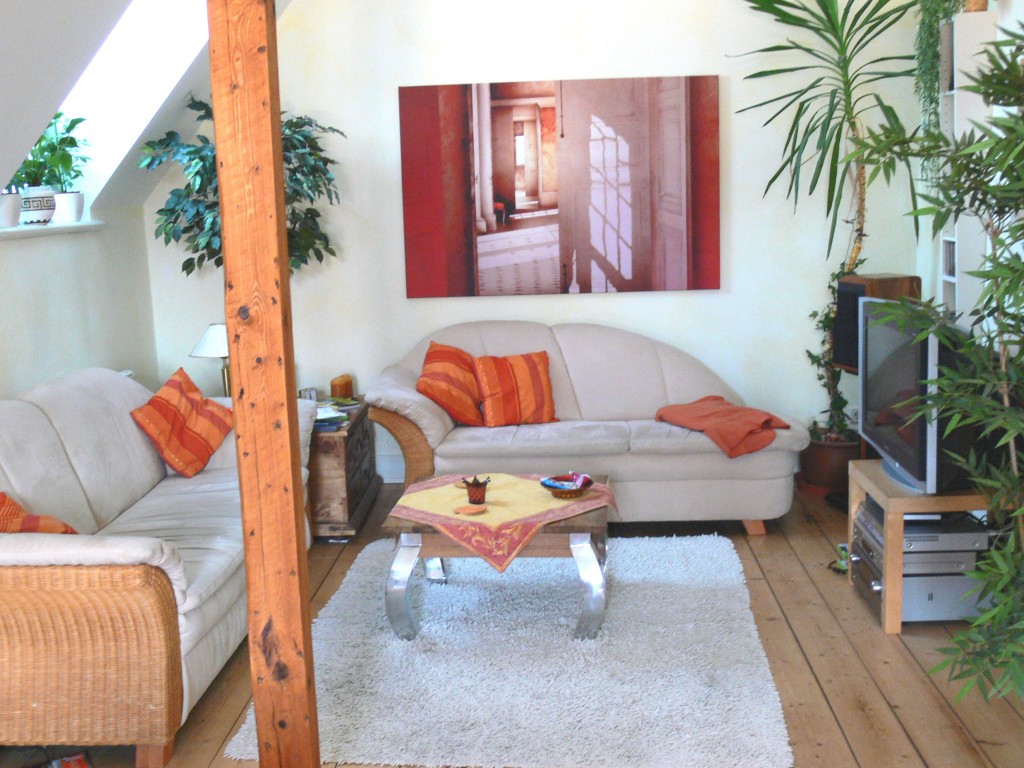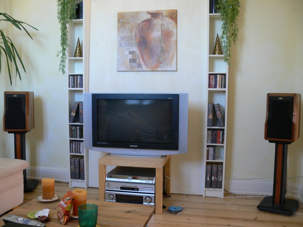 41.5432 Räume wurden zu einem Raum zusammengeführt, nachdem eine Wand entfernt worden war. Diese stand am Übergang von der Kaminecke zum Sitzeckenbereich, der früher ein separates Zimmer war. Ich finde, dass der Balken für zusätzliche Gemütlichkeit sorgt. Das Zimmer ist zwar jetzt verwinkelt, so ein bißchen wie ein sehr breites "V" geschnitten, dafür aber großzügig.