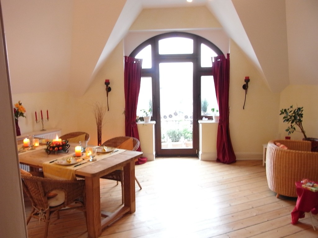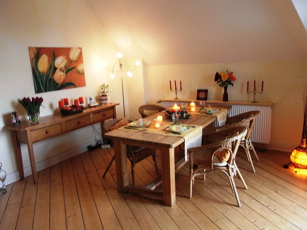Hier bleiben wir mit Freunden immer kleben, weil es so gemütlich auf den Stühlen ist. Und der große Tisch ist auch optimal für Spieleabende! Wenn mal die ganze Sippe kommt, rücken wir ihn in den Raum, dann passen mindestens 8 Stühle rum, die wir in allen Zimmern verteilt haben ;-)))