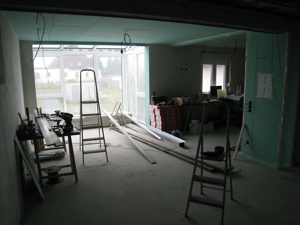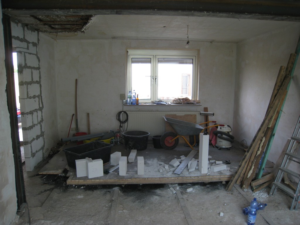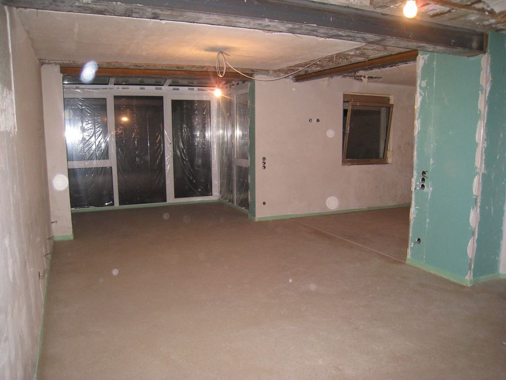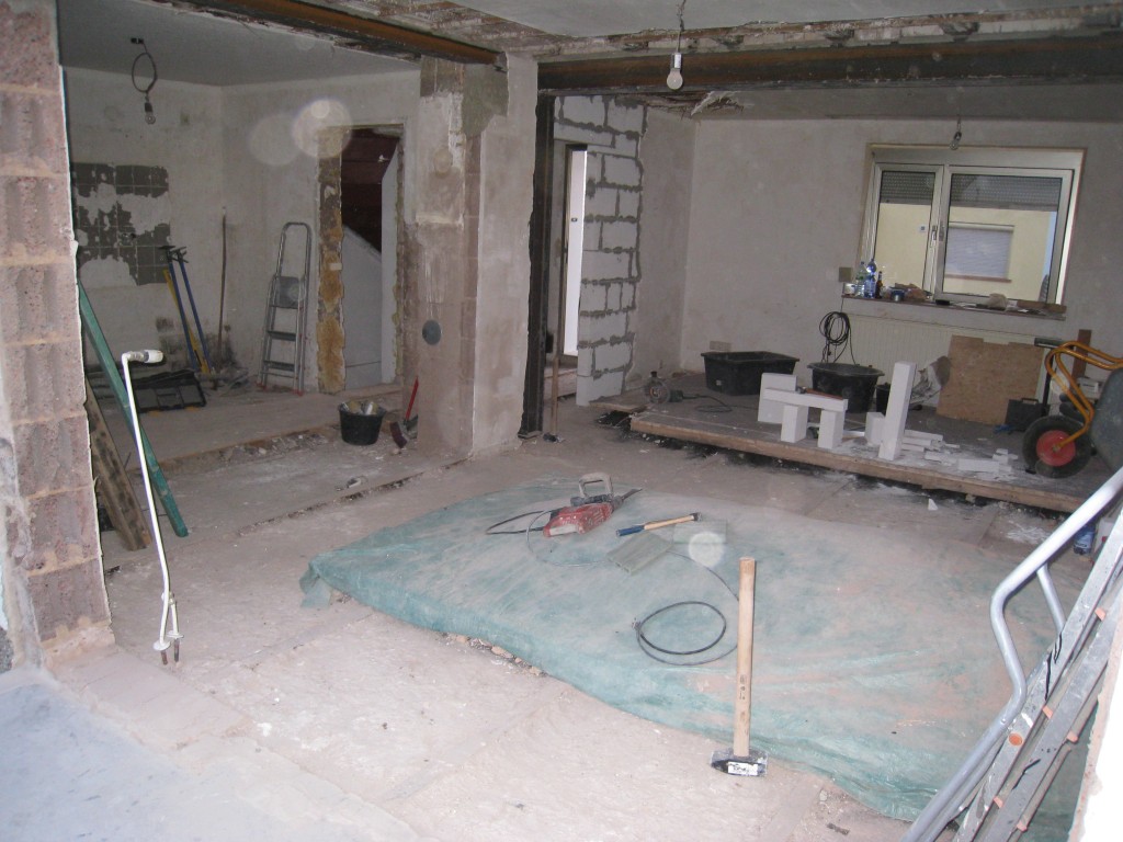Im Wohn-und Esszimmer wurden 4 Wände durchbrochen, Stahlträger eingezogen eine neue Wand eingezogen, Tapeten und Dielenboden entfernt.