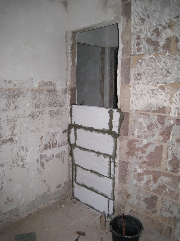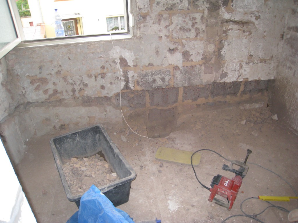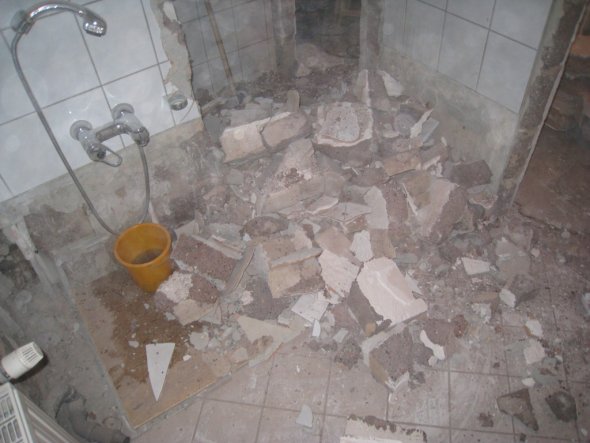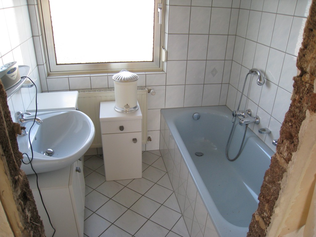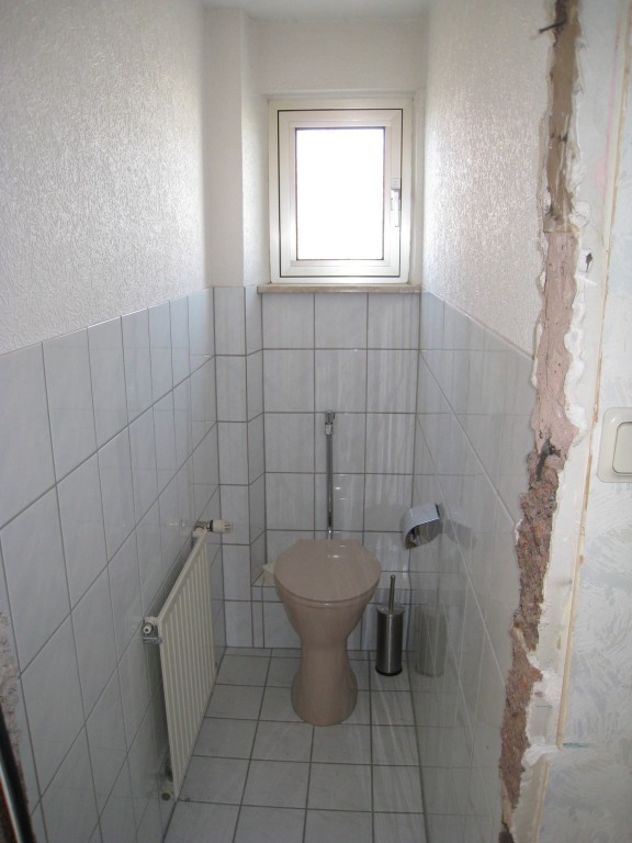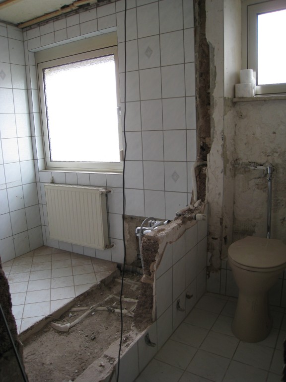 Das Bad war ursprünglich vom WC getrennt. Also wurde aus den beiden getrennten Räumen ein Raum. Dazu musste eine Wand durchbrochen werden. Weiterhin wurden die alten Fliesen entfernt, Rohr verlegt und die alte Holzdecke entfernt.
