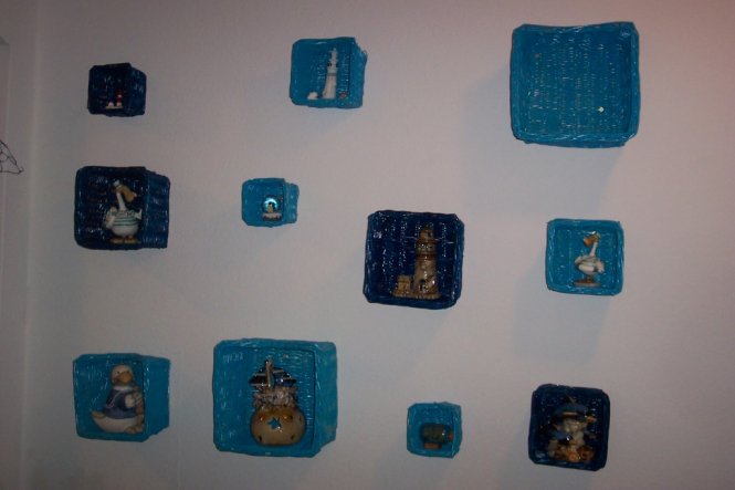 Als Leuchtturm-Fan mußte in der neuen Wohnung wenigstens ein Zimmer maritim werden. Nun sind es drei. :-) An der Wand hängen Rattan-Körbchen, die ich einfach mit blauem Lack besprühte und die nun als Setzkasten dienen.