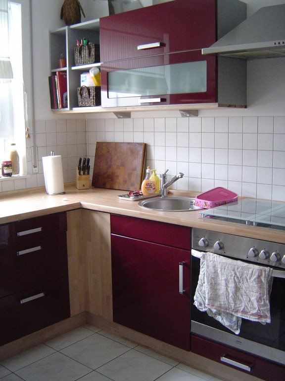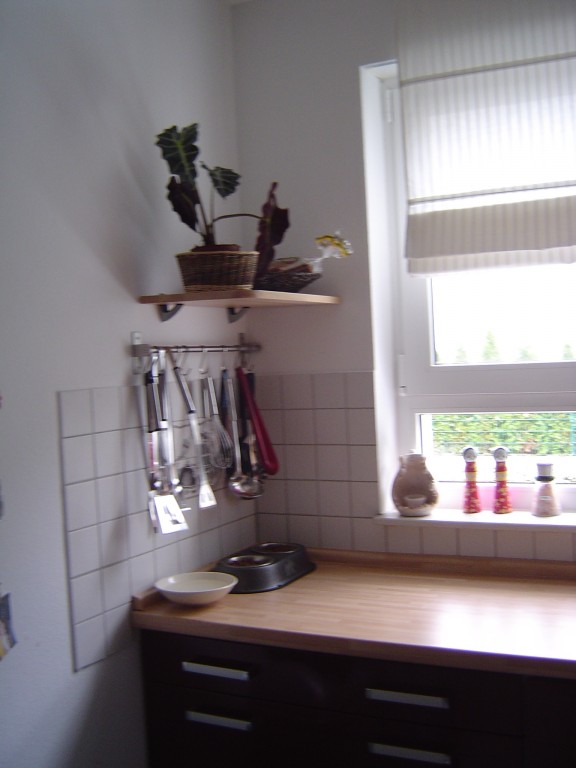 Die Bilder zeigen einen Teil unserer Küche. Ein neuer Vorhang muss noch her, den haben wir erstmal nur hingehängt damit es nicht so nackig aussieht. Nach unserem Umzug haben wir die Küche mit dem hellen Holz kombiniert. Auch die Abzugshaube muss noch fertig gemacht werden.