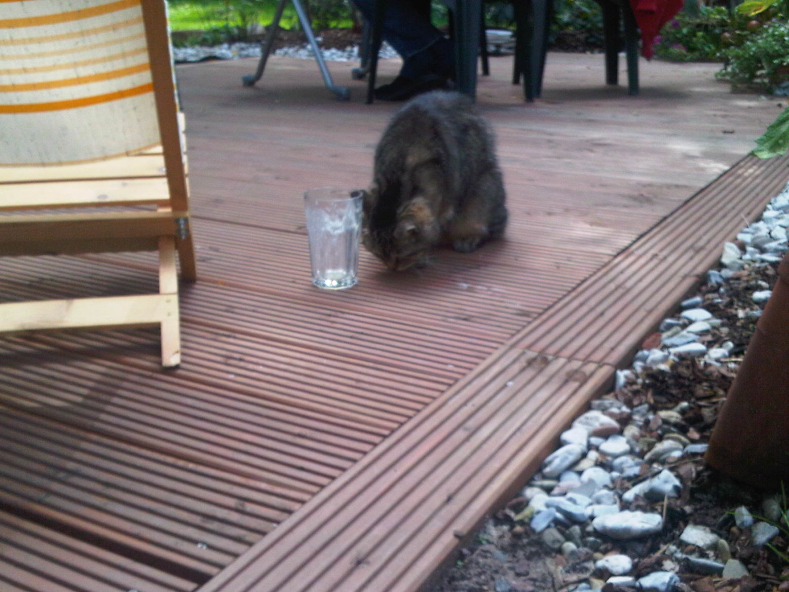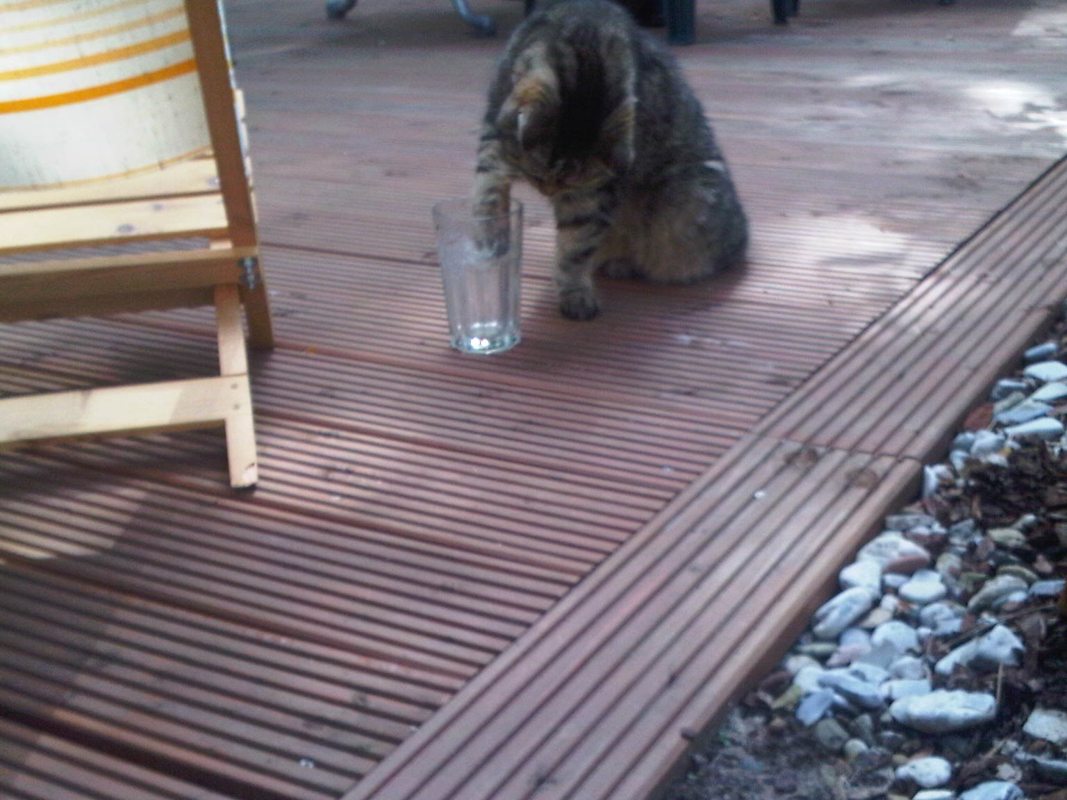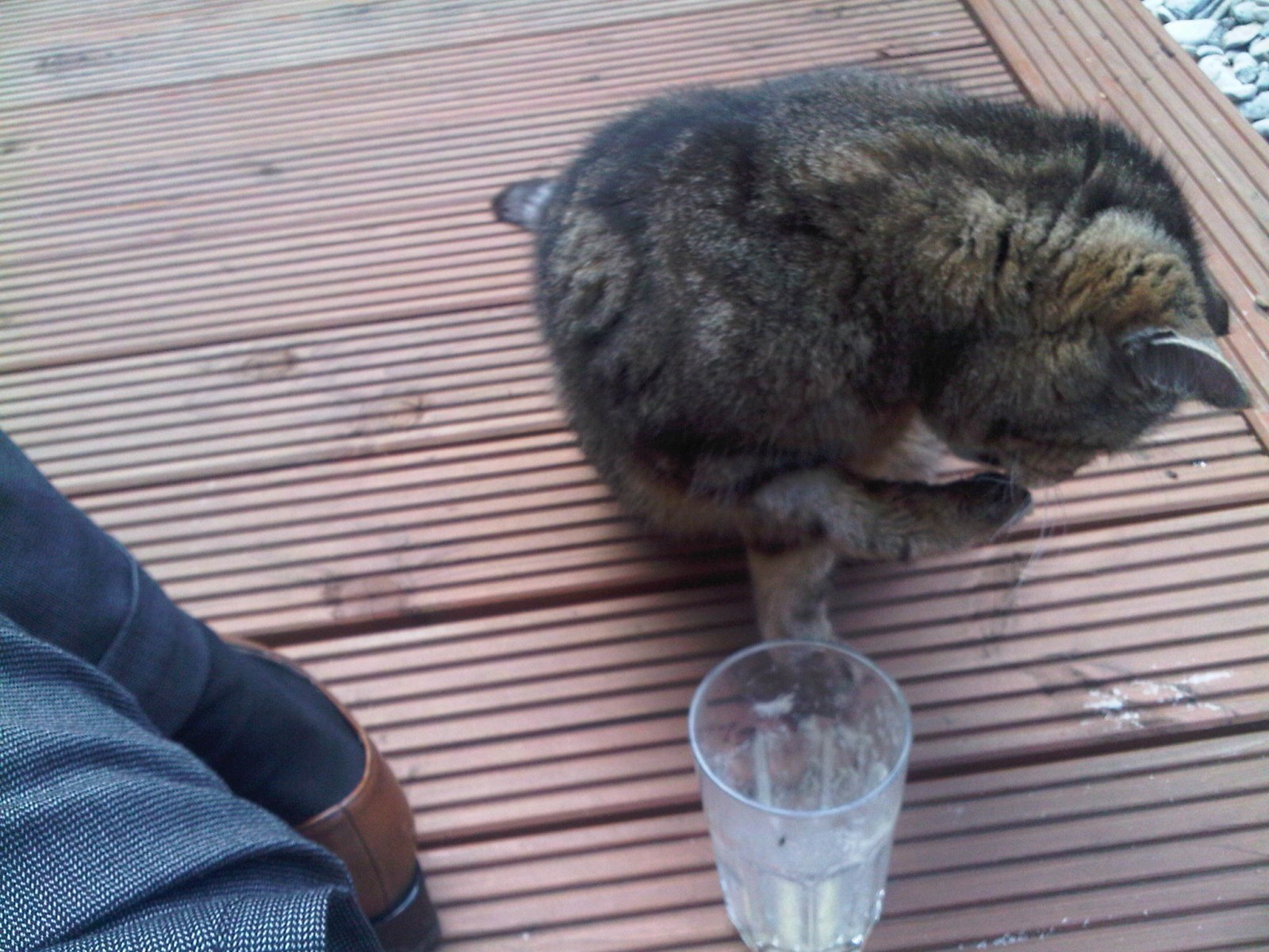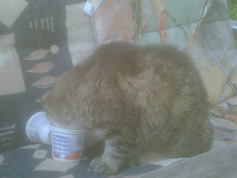Unser Hauskater mit seiner Leibspeise - Joghurt :-) und beim Probieren von Aprikosenmilchshake