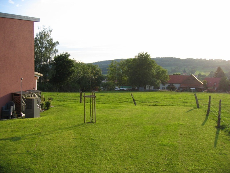 Aufgenommen von der Einfahrt her. Neben dem Blech-Geräteschuppen habe ich Rankgitter angebracht, damit man den Schuppen dann nicht mehr so sieht.
