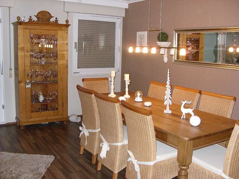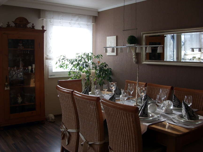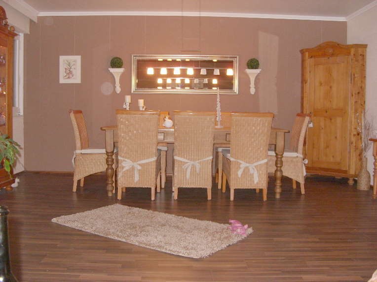 ... unsere Essecke im neuen Haus. Dunkler Laminatboden, zwei Wände in Mocca und 2 Wände in hellbeige.