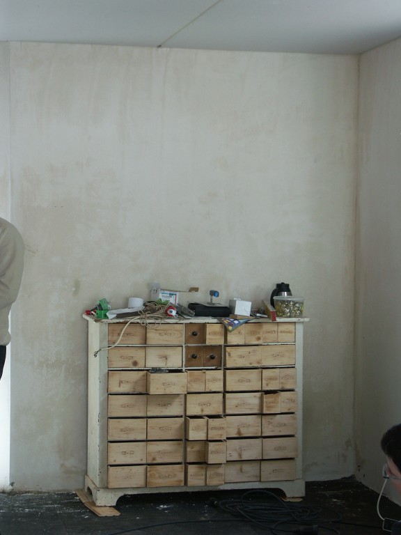 Da wo jetzt der noch nicht fertige Schrank steht, wird der Esstisch stehen