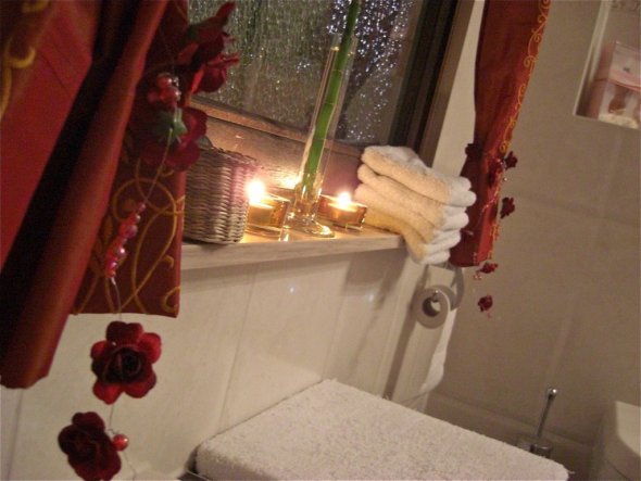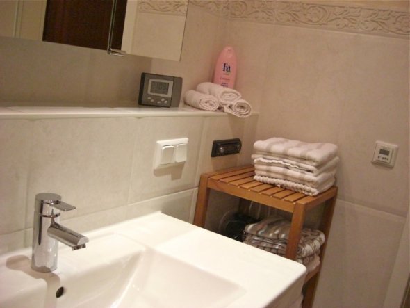 13.580Hier unser klassisch warmgehaltenes Bad mit Spachteltechnik an den Wänden und der Decke, Hochglanzfliesen,Fußbodenheizung,offener Dusche und Autoradio,Lichtschalter und Toilettenpapier:-)
