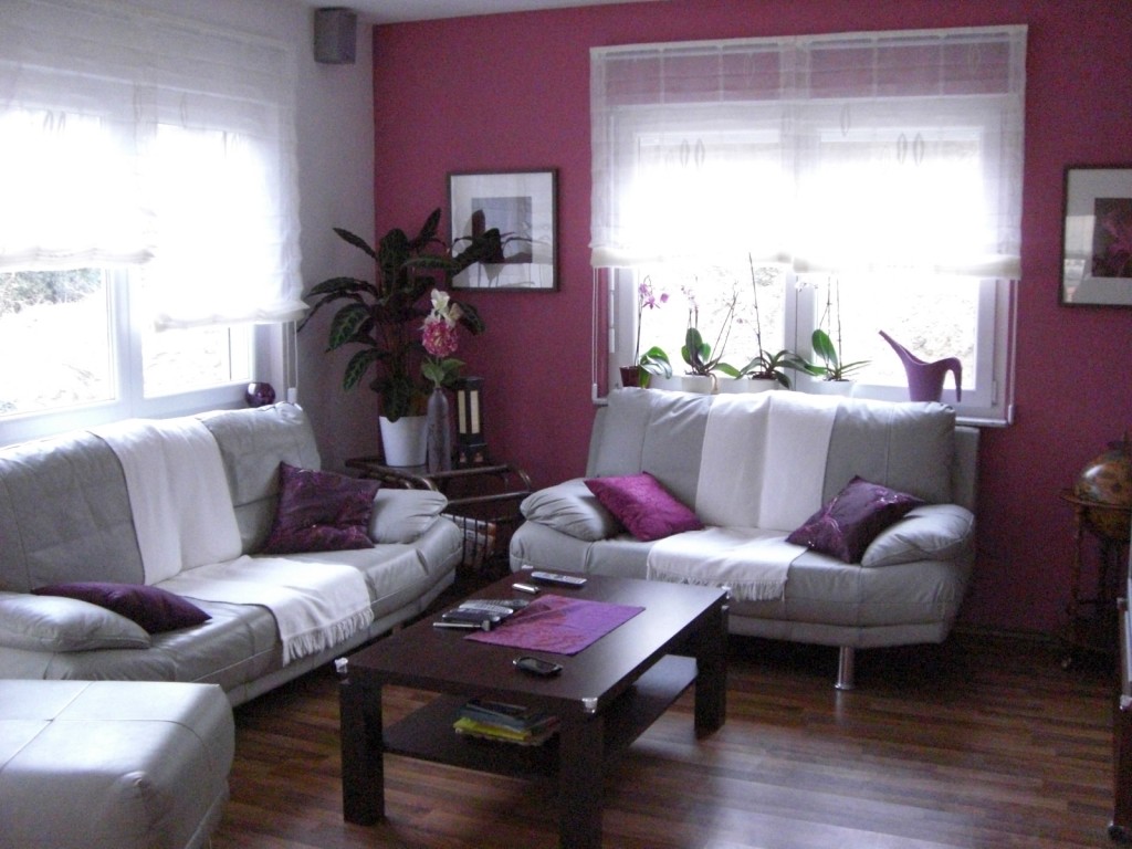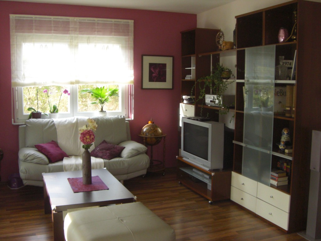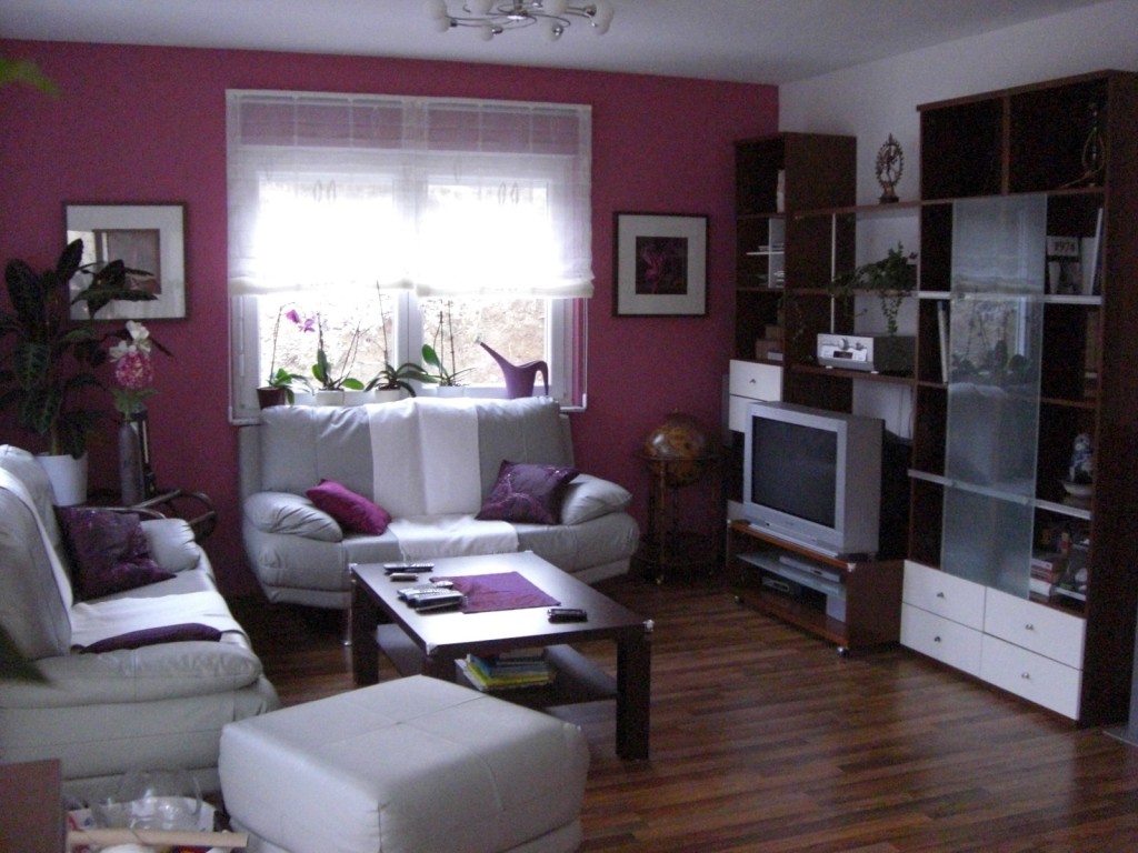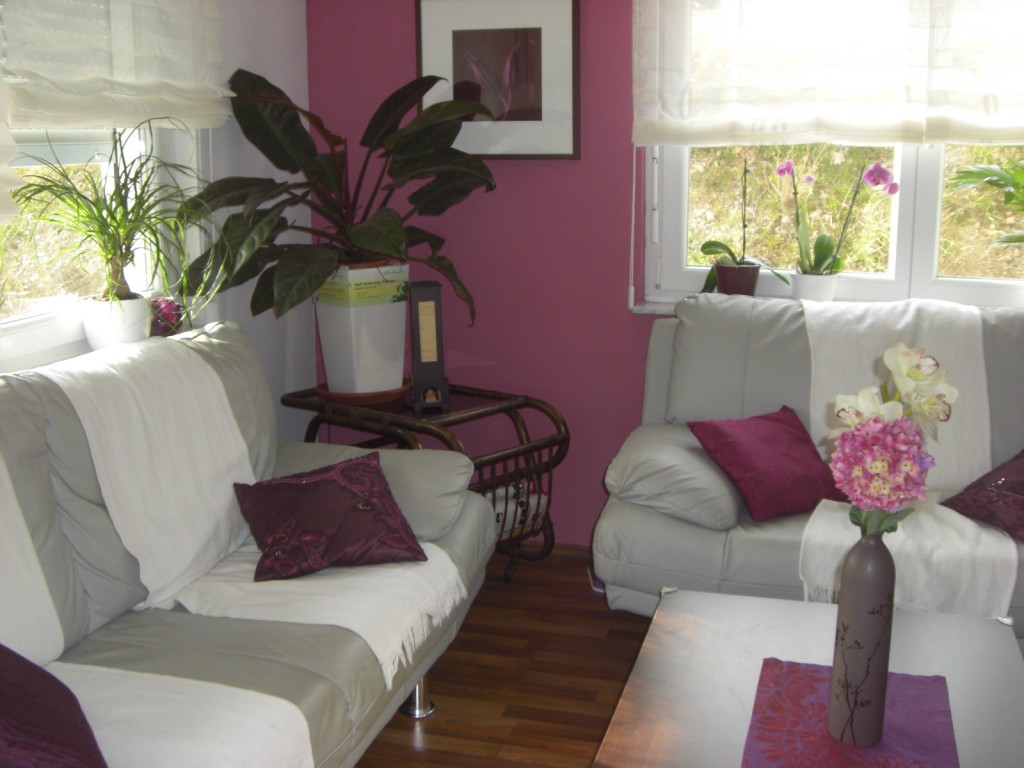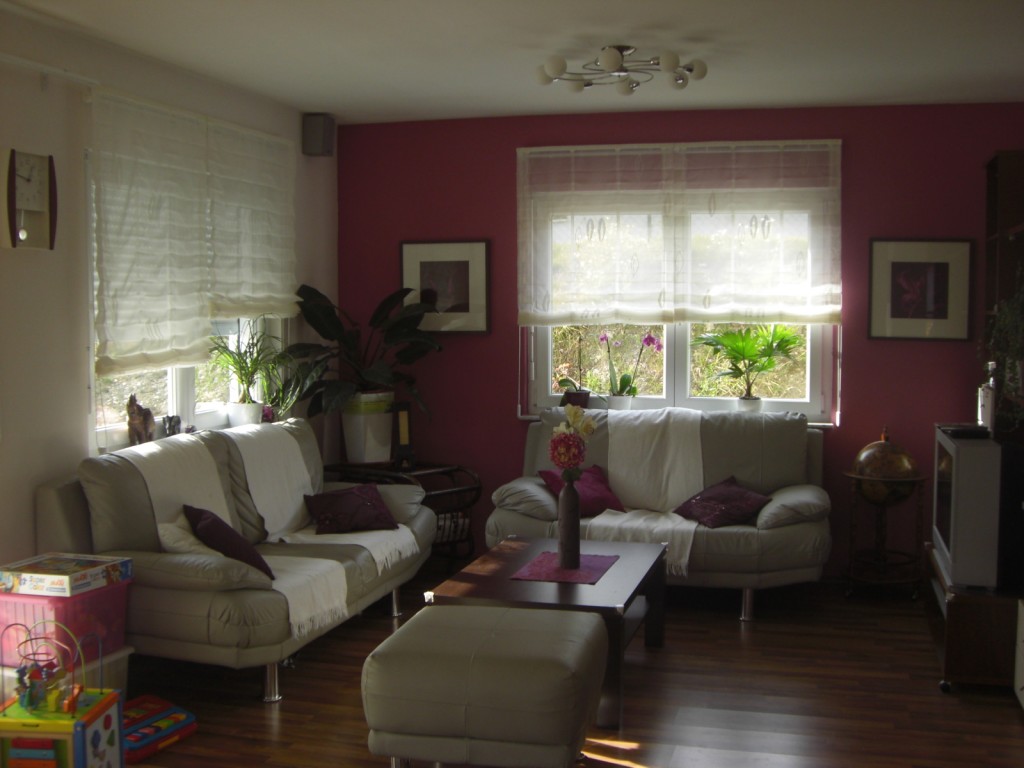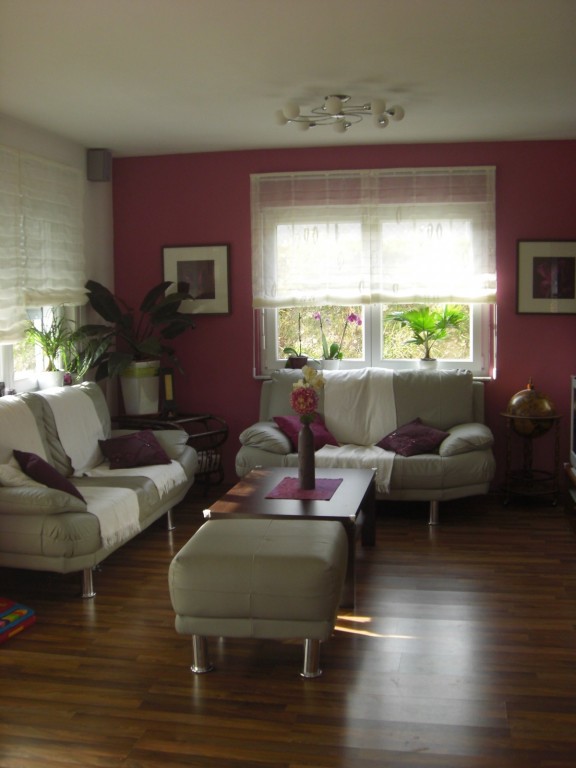 hier unser Wohnzimmer, ich habe warme brombeer und lilatöne gewählt, da ich finde, das wirkt sehr gemütlich und wohnlich.