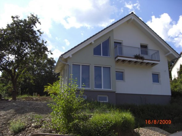 das ist unser Traumhaus von außen, sehr gut zu erkennen, dass wir auf einem Hang gebaut haben.