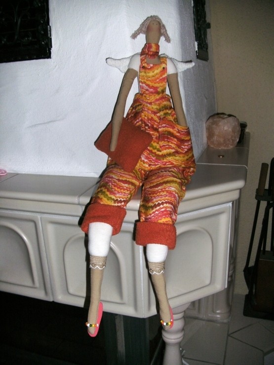 Inzwischen gibts einige dieser "Krims-Krams-Handtaschen für meine Tochter... An jede hab ich irgendwas drangehängt. An dieser baumelt jetzt ein Mini-Träumerle nach Tilda-Art ;) Aurelia gefällts - und mir auch :)