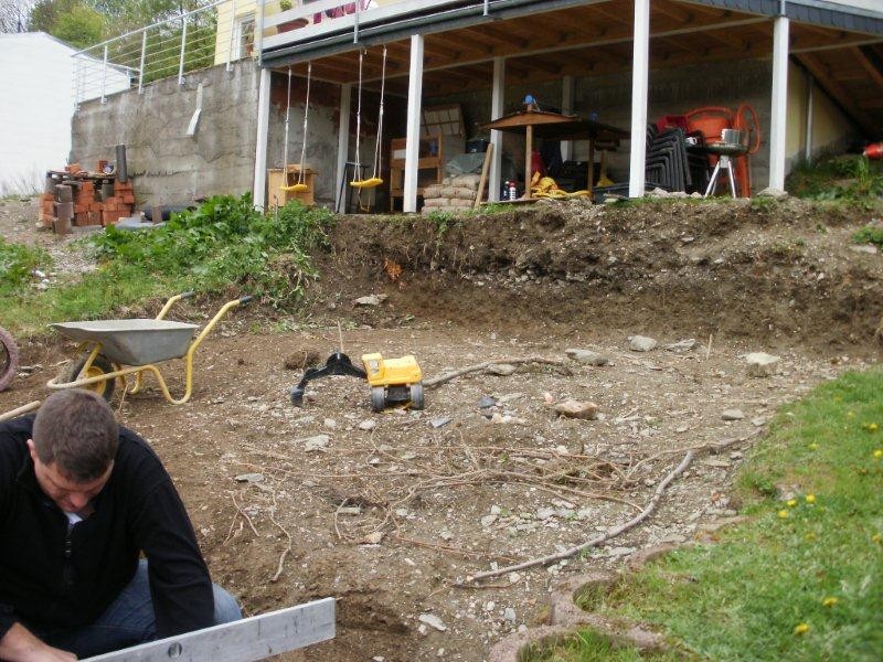 Wir hatten das Glück ca. 320 runde Florwallsteine geschenkt zu bekommen. Mein Mann hat 7 Reihen a 22 Steinen aufgesetzt um das Grundstück einigermaßen gerade zu bekommen. Das war ein Höllenjob. Ein Stein wiegt ca. 40 kg. Er hat alle per Hand den Hang hinunter in den Garten transportiert.